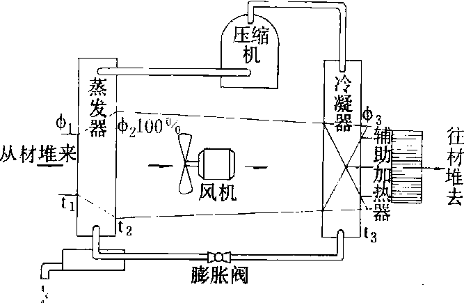 除湿干燥机(热泵)主要部件示意图 干燥原理与木材窑干基本相似。干燥开始时,窑内干燥介质由风机驱动经辅助加热器加热后进入材堆,辅助加热器可用电、蒸汽或热水作为热源。随着介质温度的上升,木材温度逐渐提高,木材中的水分向介质蒸发。令从材堆中流出的介质的温度为t1,相对湿度为φ1。当φ1到达一定数值后,除湿干燥机的压缩机启动。冷凝器内的液态制冷剂经膨胀阀减压进入蒸发器时吸热蒸发而成气态,从材堆中流出的介质,通过蒸发器外表面时与其中制冷剂发生热交换而放热冷却,其温度从t1降到低于露点温度t2,介质中水蒸气冷凝成液态后排至窑外,此时介质的相对湿度φ2为100%。气态制冷剂经压缩机压缩进入冷凝器后放热冷却再成为液态,流经蒸发器后经降温除湿的介质在冷凝器外表面再次与制冷剂发生热交换而吸热升温,温度上升为t3,相对湿度降低为φ3,然后流入材堆向木材传热并吸收木材中蒸发出来的水分。如此循环不已,直至木材的含水率降至预定值为止。在整个干燥过程中,从木材内蒸发出来的水分的气化潜热几乎全被回收利用。调节干燥温度和弥补热损失所需要的热能由辅助加热器供给。除湿干燥机通常用微处理机按照预定的基准协调各部件的动作。 多数除湿干燥机的最高工作温度为60℃。随着热泵技术的发展和新型制冷剂的研制成功,出现了用高效热泵从窑外大气中吸收热能以加热木材的除湿干燥机,它的最高工作温度可达80℃。能耗低是除湿干燥法的一大特点,普通除湿干燥机每耗电1千瓦小时可脱水0.83~1.6千克,带有高效热泵的除湿干燥机耗用同样电能则可脱水1.25~2.5千克,但高效热泵不宜于在寒冷地区使用。此外,由于工作温度低,除湿干燥法特别适合于干燥初含水率较高的硬阔叶树材和厚板材。除湿干燥操作简单,干燥质量较好,不需要锅炉等设备,无污染。缺点是干燥周期长,除湿干燥机的价格较贵,用电作除湿机动力,运转成本增高,一旦发生故障,要由专业人员维修。 |