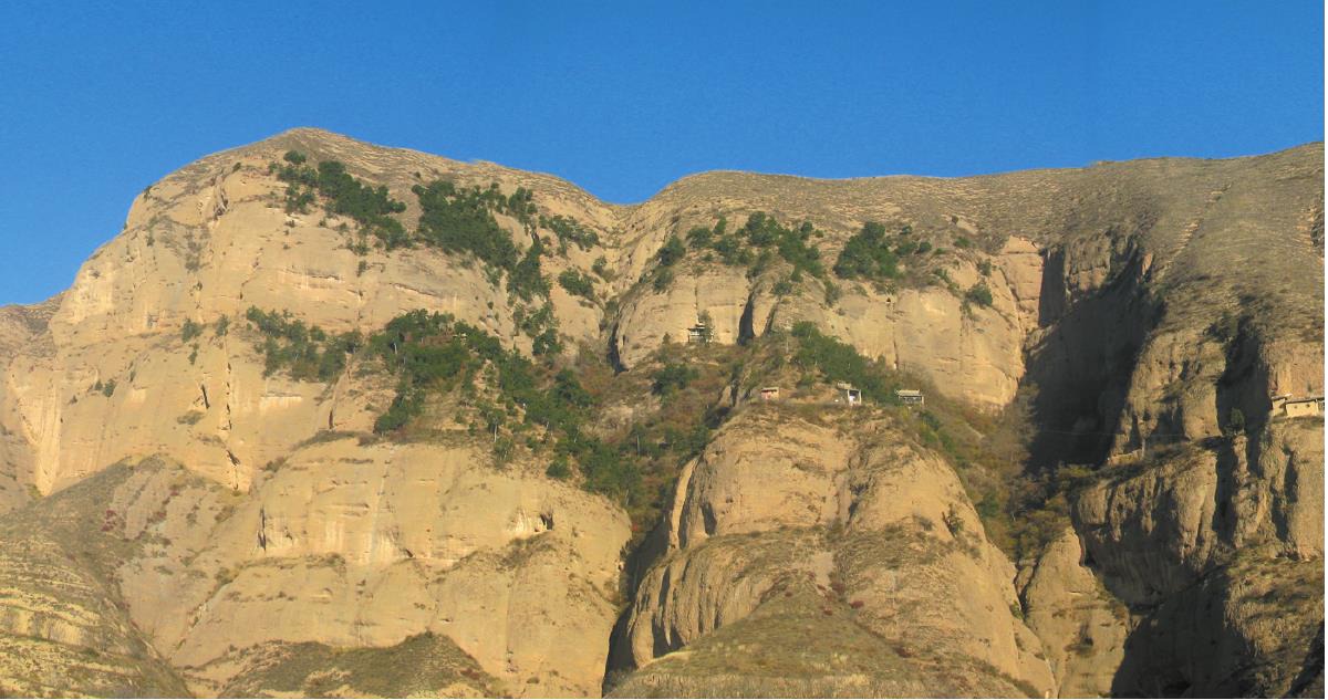 木梯寺远眺 木梯寺石窟位于武山县马力乡杨家坪村石渭山。山巅原有横跨九梁十沟的寺院, 四周为悬崖绝壁,仅北侧有一山门,设数丈木梯供攀登入寺,故名。据明代《重建木梯寺序》载:寺初建于汉,自汉至唐,历代经营,内有10殿9洞2砖塔。现存殿宇4座,窟龛18个, 塑像80余身,壁画234幅面积约2 100平方米。窟形有方形平顶、人字坡顶、四面坡顶、穹庐顶等。塑像多为石胎泥塑,保存较好的有5、7、9号窟, 塑有释迦牟尼、燃灯诸佛, 文殊、普贤诸菩萨,及力士、罗汉、供养人等。造型古朴,技艺精湛,一部分保存有北魏、唐代艺术特征。大佛阁内还有14米高的大佛一尊。殿宇建筑依山临谷,因势起屋,极具匠心。为省级文物保护单位。 |