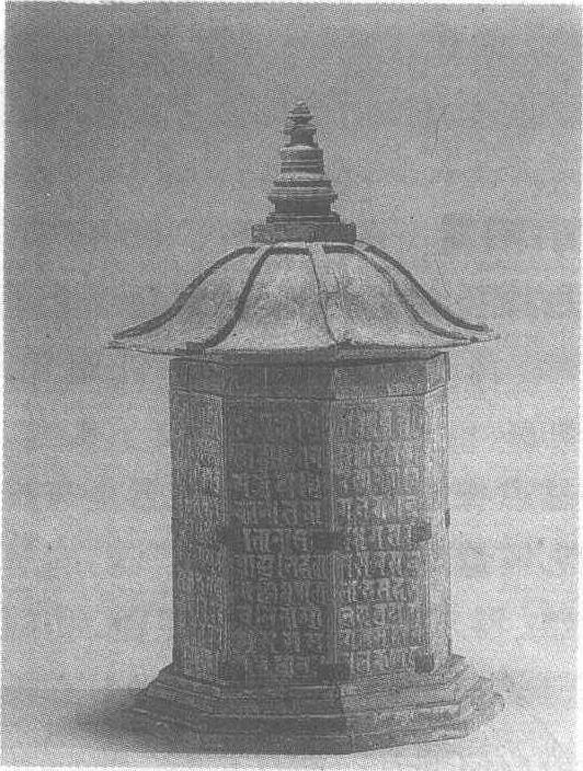 | 释义 | 木缘塔西夏。通高76厘米。1977年甘肃省武威西夏纪年墓出土。甘肃省武威地区博物馆藏。此塔为盛火化骨灰之用,分座、身、塔顶和刹四部分。塔座呈八角形,台阶式四级,饰红色。塔身由八块木板合成,每个合缝处都用两条长方形铁片联接,上用白粉书写“一切如来咒”,“一切如来百字咒”等梵文咒语。塔顶如覆荷叶形,由八块近三角形的弯曲的木板组成,其上均彩绘云气纹并用朱红色书写一梵文字。刹本是佛塔顶部装饰,亦称相轮,此刹为另制后安装上的。塔顶内壁墨书“故考任西经略司都案刘德仁,寿六旬有八,于天庆五年岁次戊午四月十六日亡殁,至天庆七年岁次庚辰□夏十五日兴工建缘塔,至中秋十三日入课讫。”59字。此塔制作精致,保存亦尚完好,为国内考古中少见,是研究西夏社会生活的重要资料。