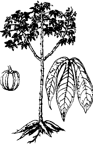 木薯 木薯又称树薯,属大戟科,一年或多年生草本灌木。生长于热带和亚热带,原产南美州,我国侨胞早年带回两广栽培,壮族各地均有生产。株茎高一至二米,茎多分为三叉状,掌状复叶,分裂。薯块根富含淀粉,也含氰酸素,食用前须经清水多次浸泡。可加工成粉丝、糕点、零粉等。木薯淀粉是重要的工业原料,用于浆纱、布,制药片、酿酒,还是生产饴糖、葡萄糖的原料。叶可作饲料喂鱼养蚕。 木薯大戟科直立灌木。株高达3m,茎粗3~5cm。块根肥厚,富含淀粉。有乳汁。叶纸质,近圆形,径10~20cm,掌状深裂近基部,裂片3~7,裂片倒披针形,长8~18cm、宽1.5~4.5cm。叶柄长8~22cm,基部膨大,中空,紫红色。雌雄同株,无花瓣。圆锥花序长5~8cm。蒴果椭圆形,长1.5~1.8cm,径1~1.5cm。种子扁长圆形,长约1cm,种皮硬壳质,具斑纹。花期4月,果期6月。中国1820年由南洋引入栽培,重要木本粮食和淀粉作物。品种有面包木薯、糯米木薯等。全属170种,分布南美热带。中国引入2种。 |