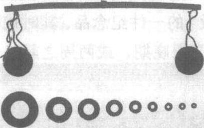(重量单位:克,长度单位:厘米)。1954年湖南省长沙左家公山15号墓出土。湖南省博物馆藏。这是至今为止保存最为完整的一套权衡器,是战国时期,楚国用于称量黄金的小型衡器。木衡杆呈扁条形,杆中央钻有一孔,以便穿丝线提钮;杆两端内0.7厘米处,各有一穿孔,内穿有四根丝线,用来系铜盘。铜盘为二个,呈圆形,广口圆凸底,边缘有四个对称的用来系线的小孔。环权共有九个,大体依倍次增大。