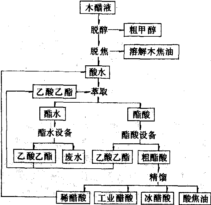 萃取法制取醋酸的工艺流程示意图 往酯酸设备。酯水从底部引出, 其中含乙酸乙酯8.4%,送往酯水设备回收乙酸乙酯。酯酸送入酯酸设备的精馏塔下部,从塔顶蒸出乙酸乙酯再用于萃取。酸液从精馏塔流入提馏塔蒸出残存的乙酸乙酯后,从塔底放出粗醋酸。以上加工制得的粗醋酸中含有蚁酸、丙酸、丁酸、戊酸、醛类、酮类、醚类、醇类和焦油杂质等,需要进一步精制。精制的方法一般用精馏法分离低沸点的醛类和醇类等以及高沸点的焦油杂质,制取冰醋酸、工业醋酸和食用醋酸等成品。 醋酸为无色透明液体,有刺激性气味,在16.3~16.7℃时结晶。用来制造醋酸酯、醋酸盐、醋酸纤维、醋酐、食用醋和药品等,也用于纺织、化工等工业部门。 甲醇 脱醇过程中得到的粗甲醇含醇类、酯类、酮类、醛类、酸类、甲胺、吡啶和呋喃类化合物。这些物质常能形成恒沸混合物,除甲醇外,难于用普通精馏的方法把它们分离。加工的方法是先将粗甲醇用水稀释到浓度为20~30%,澄清后,约占原体积15~20%的木醇油浮出水面,分离后,可加工制取溶剂、恒沸点剂、浮选起泡剂或木焦油呋喃。稀释时如加入氢氧化钠溶液以中和其中的酸类,可防止设备的腐蚀。 稀释过的粗甲醇水溶液,在间歇式设备中精馏时可以得到丙酮酯溶剂(46~60℃)、浓甲醇(64~69℃)、丙烯油(90~95℃)、糠醛油(95~100℃)和其他半成品馏分。浓甲醇中仍含杂质,通过再稀释和精馏可制得甲醇成品。甲醇为无色、透明的可燃性液体,带葡萄酒气味,有毒。用于制造福尔马林、乙酸甲酯、缩醛、胺仿等。 木醋液木材干馏得到的液体产物在澄清分离出沉淀木焦油后剩下的红褐色液体。有刺激性气味。主要含水、醋酸、甲醇等。可加工制得醋酸、甲醇等产品。 木醋液pyroligneous acid木材干馏得到的液体产物在澄清分离出沉淀木焦油后的红褐色液体。木醋液有特殊的烟焦气味,密度1.020~1.050,含10%~20%的各种有机化合物如酸类、醇类、酮类、酯类、酚类、醛类等。可直接用作土壤杀菌剂,能有效地防治针叶树幼苗立枯病,或作防臭剂和食品香料。木醋液进一步精馏可得粗甲醇和脱醇木醋液。前者可加工制取甲醇和溶剂等产品;后者可加工制取醋石、醋酸钠、工业醋酸、食用醋酸和冰醋酸等,用于纺织、皮革、食品等工业部门。 |