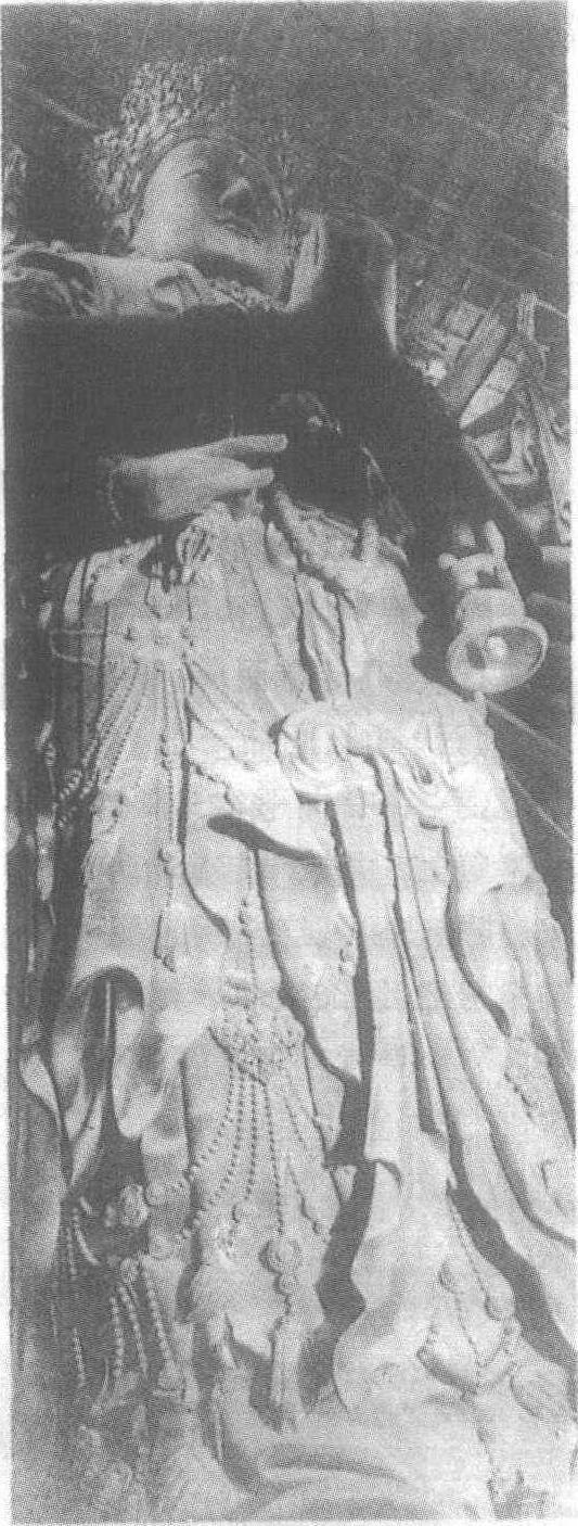 | 释义 | 木雕千手千眼观音菩萨清。高22.28米,腰围15米,重约120吨。由松、柏、榆、杉、椴五种木料雕成。这是河北省承德市普宁寺大乘阁内雕像。菩萨头戴结跏趺坐小佛雕花宝冠,颈戴佛珠,身饰华丽的璎珞,双手合十,立于精美的石莲花须弥座上,微微低头闭目沉思。背后用以表示法力无边、普渡众生的40只手阳光一样地四射着。手中或托日月以示佛法无量,或捧哈达用作对祖先的敬仰,或持轮、螺、伞、幢、花、瓶,鱼等供品八宝,象征吉祥如意,或握降魔伏妖的刀、枪、剑、戟兵器。每只手心还有一只眼。此菩萨体态高大,造型优美,雕刻精细,是我国现存最大的雕漆像,堪称古代雕塑艺术的杰作。
