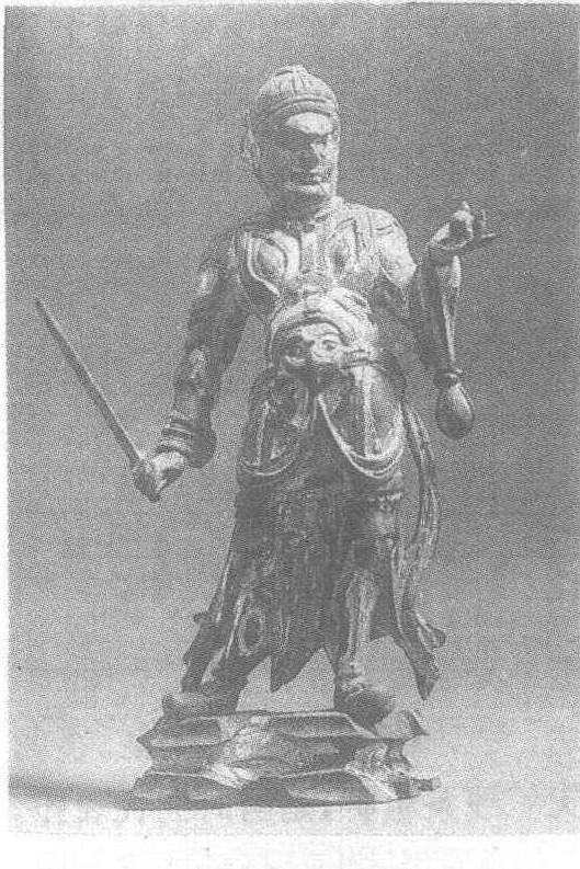 | 释义 | 木雕天王立像北宋景祐元年至庆历三年(公元1034—1043)间。通座高12.9厘米。1966年发现于浙江瑞安仙严寺慧光塔。浙江省博物馆藏。天王右手握剑,左手持珠立于云头台座上,头戴瓜棱盔,身披铠甲,腰围长带及地的护腹,护腹上雕饰一眉骨粗大,双目凸突,惊恐万状的人头。天王双目圆睁,严阵以待,威武强悍,令人望而生畏。