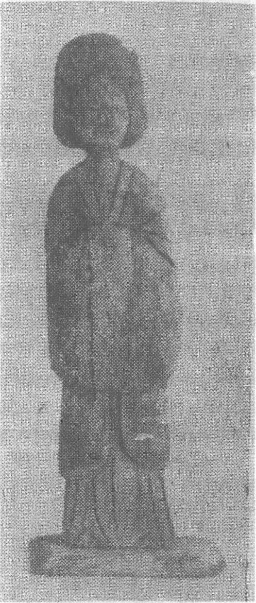 | 释义 | 木雕盛装女俑五代。1975年出土于江苏省邗江县蔡庄。江苏省扬州博物馆藏。桫木雕成。女俑头挽高髻,两鬓贴鬓发,上身穿长至膝的圆襟宽袖袍,下着曳地长裙,袖手立于长方形木座上,微迷着眼,脸上浮现出一丝微笑,似在遐思着什么,神态颇为生动。她的衣着纹饰虽较简单,但处理得恰到好处,有一种织物的感觉。此墓共出土木俑44件,包括男俑、女俑、动物俑和神兽俑等,并有四肢可以活动的着衣女俑。雕刻技法纯熟,造型颇具唐代人物雕刻的面部丰满、身材匀称、仪态大方的艺术风格,是五代木雕的优秀作品,也是扬州地区历年出土木俑的上乘之作。