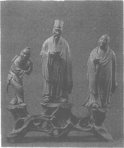| 释义 | 木雕苏轼佛印观砚清。高17.5厘米,通高25.5厘米。浙江省温州市博物馆藏。苏轼、佛印、书童站于三个连体镂孔的桦木台上,苏轼居中,其须髯至胸,头戴方顶便帽,身着宽袖大袍,右手托砚于胸前,正略有所思地低头品赏;佛印披袈裟居右,左手捻佛珠,右手举至胸,头微仰,嘴稍张,眯眼睥睨苏轼;书童居左,稍后,弓身负书囊跟随着,俯首嘻笑,自娱自乐,三人各具神态。苏轼,北宋文学家,四川人,字子瞻,号东坡居士,诗、词、文章均有较高成就,擅长书画,有《东坡全集》、《东坡词》等。佛印为其好友。