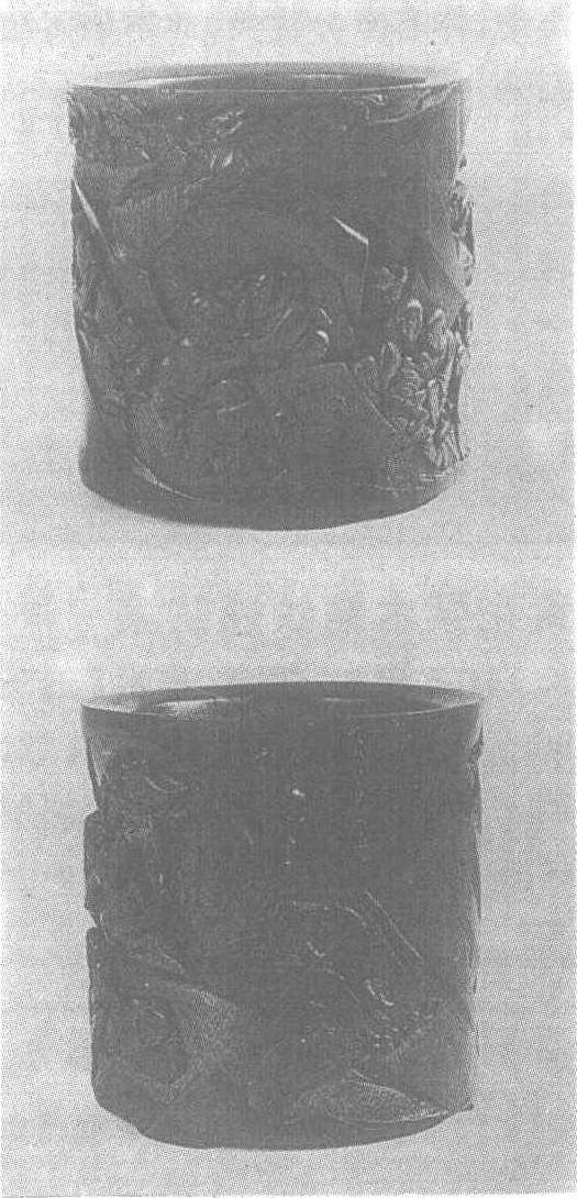 | 释义 | 朱三松竹雕饮中八仙笔筒明天启2年(公元1622)。高13.8厘米,口径13.6厘米。北京中国历史博物馆藏。圆筒形。奇松怪柏下,李白、贺知章等八酒仙醉意朦胧,酒兴尤酣,索酒的、推让的、醉卧的……各具情态。并刻有“天启壬戌冬三松为元介宗翁作”款。笔筒刀法遒劲,人物刻画细致入微,立体感强,不愧出自名家之手。朱三松,即朱稚征,明代著名的刻竹家。他以近乎圆雕的深刻见长,是嘉定派刻竹的代表人物,与其祖父朱松邻,父亲朱小松合称“三朱”。
