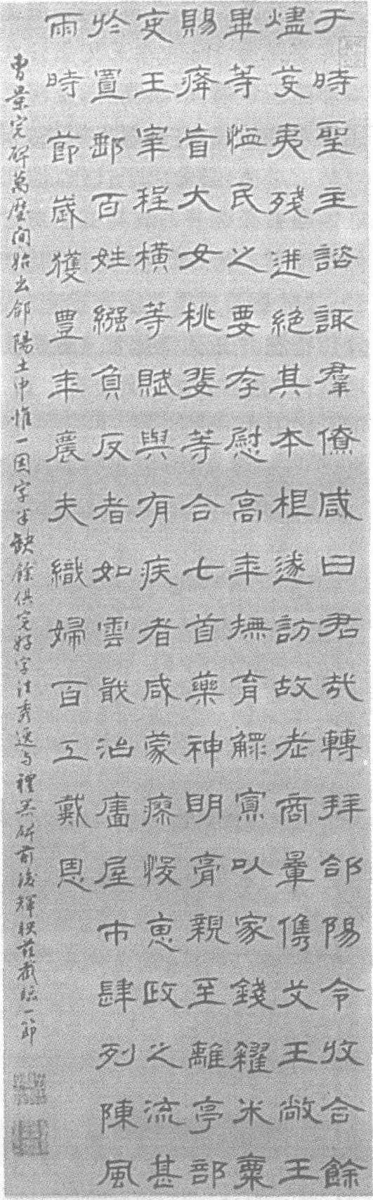 | 释义 | 朱彝尊隶书节临曹全碑清。纸本。纵104厘米,横32.5厘米。辽宁省博物馆藏。朱彝尊(明崇祯二年—清康熙四十八年,即公元1629—1709年),字锡鬯,号竹垞、鸥枋、醧舫、金风亭长,晚号小长芦钓鱼师,浙江秀水(今嘉兴)人。年少极好古学,博览群书,南北游览,并搜寻金石。康熙十八年以布衣召试博学鸿词科,授翰林院检讨,充《明史》纂修官,体例多从其议。康熙二十二年入内廷直南书房,引疾罢职,从事著述。精于考证金石,工古文,诗与王士禛同名,并称“南北二大宗”。词与陈维崧并称“朱陈”。工画山水,善八分书,笔意秀劲,韵致超逸。清秦祖永《桐荫论画》云:“竹垞古隶笔意秀劲,韵致超逸。”清钱泳《履园丛话》云:“国初有郑谷口始学汉碑,再从朱竹垞辈讨论之,而汉隶之学复兴。”著有《曝书亭集》、《经义考》、《日下旧闻》,辑有《词综》、 《明诗综》。《清史稿》卷四百八十四有传。此朱彝尊节临《曹全碑》,书后有行书跋语记曹碑出土的时代,并评价碑文书法成就可与《礼器碑》并驾媲美。隶书深得原《曹全碑》之笔意,结体方圆兼施,字画疏朗典雅,笔力遒稳刚健,章法布局整齐。然其行隶书虽比原作逊一筹,但也不失为隶书之佳作。