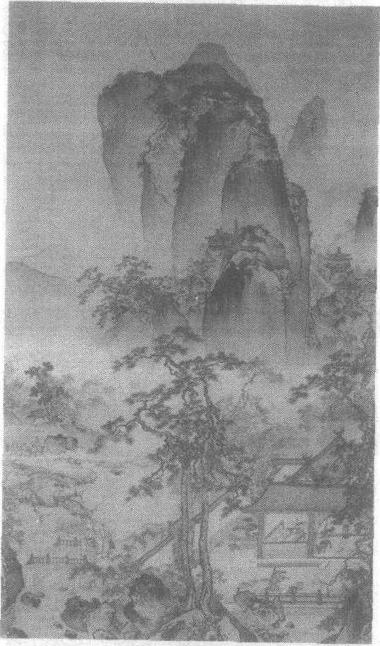 | 释义 | 朱端松院闲吟图轴明。朱端绘。绢本设色。纵230.2厘米,横124.3厘米。天津市艺术博物馆藏。朱端(生卒年不详),字克正,号一樵,海盐(今属浙江)人。少时贫,以渔樵为生。孝宗弘治十四年(公元1501年)进士,刻有〈辛酉征士〉印。武宗正德(1506—1521年)间以绘画供事仁智殿,授锦衣卫指挥,钦赐〈一樵〉图章,即以“一樵”为号。他工人物、山水、花木、翎毛,山水宗马远,人物师盛懋,花鸟效吕纪,墨竹学夏,是浙派名家之一,亦善书。此图近景绘一山中庭院,洁净优美,有宽敞明亮的房舍,舍前点缀着大大小小的盆景,院四周挺劲的苍松长于堆石间。舍中有一老翁挥毫展卷坐于桌前,忽然回首后望似在企盼着什么。透过庭院敞开的大门,见一执杖的老者携一童稚正拾级而上,走向松院。图中远景山峦耸立,山谷中云烟氤氲,一座高塔、棵棵劲松和点点房舍依稀朦胧而现。此图运笔遒劲,奔放中见工整,构图谨严,层次分明,错落有致,景物的质感较强,颇有气势。款署“朱端”。