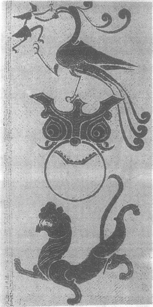 | 释义 | 朱雀白虎画像石汉。长175厘米,宽94厘米。1976年10月河南省方城东关汉墓出土。河南省南阳汉画馆藏。朱雀头缨上卷,凤尾下垂,单足立于巨目凸突、口衔圆环的铺兽头顶,张嘴啄叨仙人托盘中的丹丸。画面下方为昂首翘尾,张牙舞爪,引颈长啸的白虎。整个画面刻画得明快洗炼,流畅自如。朱雀、白虎均为汉代四神之一,将其刻在墓门上,有守护墓宅、吉祥辟邪的意义。