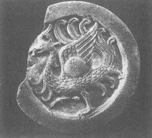 西汉。面径19厘米。1956年陕西省汉长安故城遗址出土。陕西省博物馆藏。朱雀凤冠高耸,长尾曲翘,口衔一丸,鹰翅大展,作振翼欲飞状,颇为奇异神秘。朱雀,四神之一,是人们理想中的吉鸟,象征着南方。有研究者认为,朱雀瓦当是汉未央宫南阙上的瓦当。瓦当见“‘羽阳千岁’瓦当”条目。