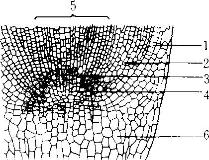 根尖的不活动中心 1.原表皮 2. 基本分生组织 3. 原分生组织 4. 不活动中心 5. 原形成层 6. 根冠 |