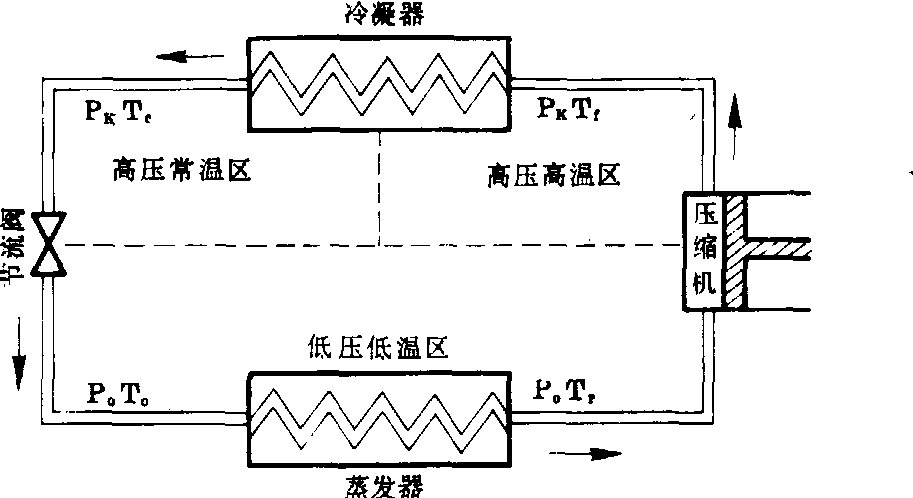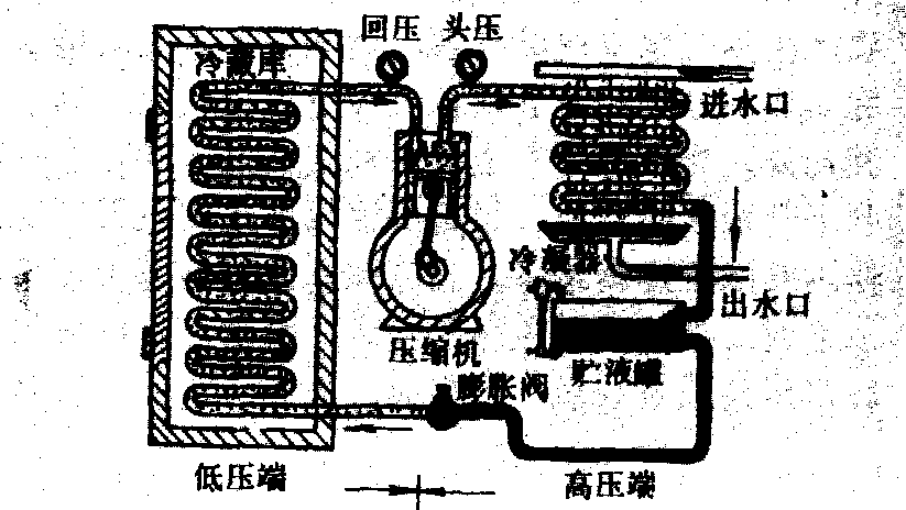 机械制冷循环模式 制冷设备 冷藏库内制冷系统包括蒸发器, 压缩机、冷凝器及所需的风机和计量器等。各种设备必须合理匹配, 才能满足冷库的需要。 蒸发器(或冷却器) 主要包括盘管(基本表面)或带翅片的盘管(延伸表面)和风机。主要作用是冷却空气, 风机则强制空气流过冷却盘管注入调温空间。为配合果品最佳贮藏条件的需要, 可配备加湿、加热、除霜和空气净化等装置。蒸发器有吊顶式和落地式两种。在旧式果品冷库, 大多是装在库内墙壁或天花板上的简单盘管, 靠重力进行空气循环。结果是地面冷, 顶部热, 造成库内温度不均匀, 不利于果品贮藏。现代蒸发器常用强制空气环流的方法,提高热交换效率,使库内温度均匀。蒸发器内制冷表面有干的蒸发盘管和加有防冻剂液体的喷淋表面。加有防冻剂的液体, 通过蒸发盘管得到冷却, 并漏淋于底部容器之中, 同时使库内空气强制流经漏淋的液体表面而得到冷却, 这种蒸发器具有冷却效率高、空气湿度大和无需除霜的特点。库内温度可通过膨胀阀, 控制制冷剂进入蒸发盘管的流量, 以改变蒸发盘管表面温度来调节。 为防止制冷剂在蒸发器或阀门泄漏, 蒸发器可不直接放在库内, 而将盘管放置在盐水(20%NaCl或CaCl2溶液)中,再将冷却的盐水输入安装在库内的冷却管组, 并不断循环来降低库内温度。这种方式库温比较稳定, 但加重压缩机负荷和增大电力的消耗。 冷凝器 制冷剂从库内吸收的热量在冷凝器中被交换到外界环境介质(水或空气)中去, 由高压高温的气态变成高压低温的液态。冷凝器有水冷和空气冷却两种形式。 压缩机 压缩机有容积往复式(活塞式)、旋转式和螺旋式三种。往复式最普遍。既可以用液态氨, 也可以用氟利昂12或22作为制冷剂。活塞的排量容积和运转速度决定制冷能力, 制冷能力以每小时的千卡数或标准吨计算, 1吨制冷能力等于3025千卡/小时,相当于融化1吨冰所需的热量。 库体结构 机械制冷必须有良好的库体结构。库体关键部件是良好的隔热层和隔汽层, 直接影响制冷效率、机械设备和库体寿命以及库的管理费用。 隔热层 用隔热材料组成以减少热源传入库内的一种热阻障。隔热材料的隔热性能用导热系数表示(1平方米、厚1米、内外温度相差1℃时,每小时传导热量的千卡数)。导热系数的倒数为热阻, 导热系数愈小, 热阻愈大, 表明其隔热性能愈好。常见的隔热材料及隔热性能如表1。 表1 各种材料隔热性能