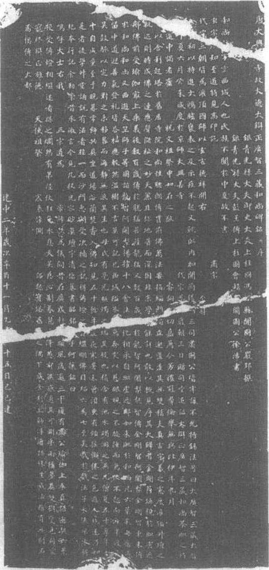 | 释义 | 不空和尚碑唐碑。建中二年 (781) 十一月刻。现存西安碑林。严郢撰,*徐浩书。楷书,23行,行48字。近石已破裂,且缺一角。书法老劲,而微少清逸之气。 不空和尚碑唐建中二年(公元781年)。高359厘米,宽102厘米。全称《唐大兴寺故大德大辩正广智三藏和尚碑铭并序》。楷书体。严郢撰,徐浩书。原立陕西省西安市南郊大兴善寺内,宋元祐五年(公元1090年)移存西安碑林至今。碑文记载了印度高僧(一说西藏高僧)不空三藏至唐王朝首都长安宣传佛教密宗的事迹。书作笔划圆劲苍老,雄健爽利,结体微扁而开张,稳重而结实,为徐浩79岁的成熟作,堪称其楷书的代表作品。徐浩(公元703—782年)字季海,唐越州(今浙江绍兴)人。官至吏部侍郎、会稽郡公、太子少师。工楷、行、八分书。传世书迹有传本墨迹《朱巨川告身》、 《不空和尚碑》、《嵩阳观碑》和《宝林寺诗》等,著有《古迹证》。不空三藏,印度人(或西藏人),佛教密宗高僧,曾在西安大兴善寺传播佛教,并翻译大乘经典77部,后经其门徒惠果在青龙寺把密宗教义传给日本和尚空海,使密宗在日本广为传播。