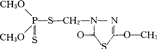 | 释义 | 杀扑磷methidathion又称Supracide,C7S-13005。有机磷杀虫、杀螨剂。化学名称:O,O-二甲基-S-(5-甲氧基-1,3,4-噻二唑酮-3-基-甲基)二硫代磷酸酯。化学结构式如下。纯品有无色结晶,熔点39~40℃,蒸气压186 μPa/20℃,20℃密度1.495 g/cm3,溶解度20℃水中250 mg/L。丙酮690 g/kg,环己酮850 g/kg,乙醇260g/kg,辛醇538 g/kg,二甲苯600 g/kg,中性及微酸性中稳定,pH13时分解50%只需30min/25℃。对鳞翅目幼虫、蚜、螨、盲蝽有较好的防治效果。工业原药急性口服LD50大鼠52 mg/kg,经皮LD50为640 mg/kg,吸入LC50为3.6 mg/L(4 h),兔经皮LD50为200 mg/kg。