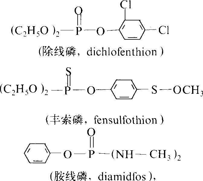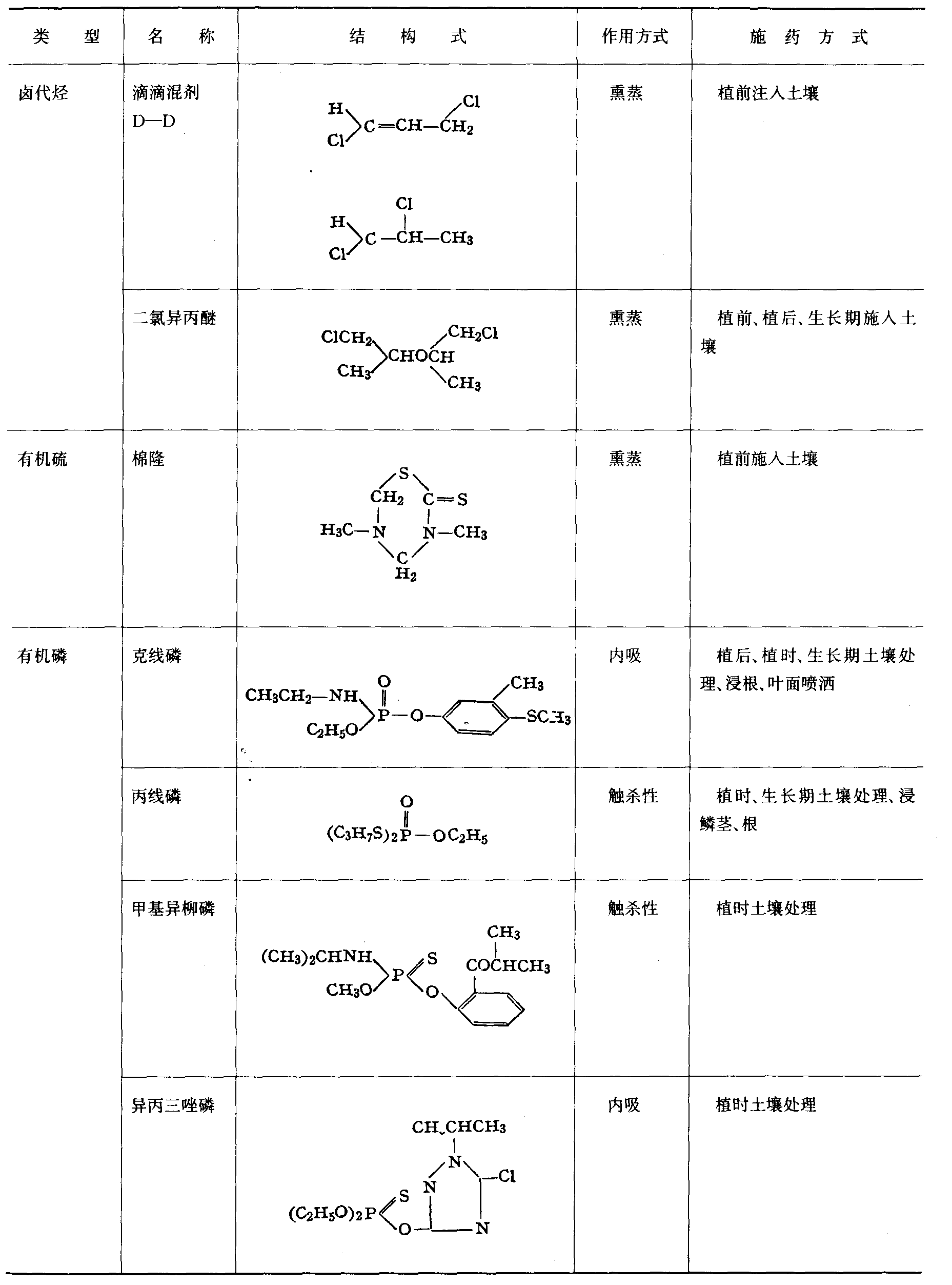 杀线虫剂nematocides用于毒杀线虫的农药。许多杀线虫剂也是杀虫剂和杀菌剂,有的也是除草剂。早期使用的氯化苦、溴甲烷、滴滴混剂就是对地下害虫、病原菌和线虫都有毒杀作用的药剂; 棉隆既能杀线虫,也能杀虫、杀菌和除草。 简史 杀线虫剂的应用是从19世纪末开始的。1881年法国首先用CS2处理土壤防治甜菜线虫;1919年有人发现氯化苦的杀线虫作用,1943年夏威夷菠萝研究所的昆虫专家卡特(W.Carter)发现滴滴混剂的杀线虫作用;1955年麦克拜斯(C.W.Mcbeth)等报道了二溴氯丙烷的杀线虫活性,在防治线虫上起了重要作用;1955年曼泽里(M.A.Manzelli)报道了第一个有机磷杀线虫剂除线磷(dichlorofentthion)。1962年美国联合碳化物公司开发了涕灭威,1969年美国杜邦公司开发出草肟威,同期FMC公司开发了克百威等氨基甲酸酯类杀线虫剂。70年代至80年代许多有机磷杀线虫剂被开发出来,如拜耳公司的苯线磷、华中师范大学的甲基异柳磷等已广泛应用于多种线虫的防治上。有机磷杀线虫剂的开发,把杀线虫剂提高到一个新的阶段,即由强熏蒸作用的药剂发展到内吸、胃毒和触杀等多种作用方式的药剂。因而使用药方法多样化,施药时间更为灵活。 品种类型 按照化学结构主要可分为4类: 卤化烃类杀线虫剂 在生产上使用较早的杀线虫剂,包括有滴滴混剂、溴甲烷、氯化苦、二溴乙烷和二溴丙烷等。这类杀线虫剂具有较高的蒸气压,多是土壤熏蒸剂,通过药剂在土壤中扩散,直接毒杀线虫。由于有对人毒性大和田间用量多等缺点,这类杀线虫剂的发展受到限制。二溴氯丙烷经动物试验有慢性毒性,故1977年在美国首先被禁用。 硫代异硫氰酸甲酯类杀线虫剂 这类杀线虫剂能释放出硫代异氰酸甲酯,即释放出氰化物离子使线虫中毒死亡。主要品种有威百亩、棉隆。 有机磷类杀线虫剂 这是一类发展较块、品种较多的杀线虫剂。线虫对这类化合物 一般较敏感;其作用机制是胆碱酯酶受到抑制而中毒死亡。不少品种有内吸作用,有的则表现为触杀作用,共同特点是杀线虫谱较广,并且在土壤中很少有残留,是目前较理想的杀线虫剂。主要品种有苯线磷、丙线磷、除线磷、丰索磷、胺线磷、克线丹和甲基异柳磷等。  氨基甲酸酯类杀线虫剂 在生产中使用较多的一类杀线虫剂,主要有涕灭威、克百威。均为高毒、广谱性杀线虫剂,也是重要的内吸杀虫剂。其作用机制主要是损害神经活动,减少线虫迁移、侵染和取食植物,从而可减少线虫的繁殖和危害。