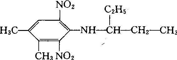 | 释义 | 杀草通pendimethalin又称除草通、二甲戊乐灵。二硝基苯胺类选择性除草剂。化学名称:N-1(乙基丙基)-2,6-二硝基-3,4-二甲基苯胺。化学结构式如下。原药为无臭橙黄色结晶,熔点 54~58℃。25℃时蒸气压为4×10-3 Pa。几乎不溶于水,可溶于氯代烃类及芳香化合物溶剂。在碱与酸性条件下稳定。通过抑制根与茎的分生组织而抑制杂草幼苗的生长,控制正在发芽的杂草。适于大豆、花生、玉米、棉花、烟草、蔬菜、马铃薯等旱地作物及果园使用,防除一年生单、双子叶杂草,对堇菜属、婆婆纳属及葎草等难以防除的杂草有效。大豆播前、播后苗前,玉米、花生、棉花等播后苗前使用。土壤干旱情况下,施药后需轻耙,以提高效果。对人、畜低毒,大鼠急性口服LD50为1 050~1 250 mg/kg,兔急性经皮LD50>5 000 mg/kg。对鱼类高毒。
