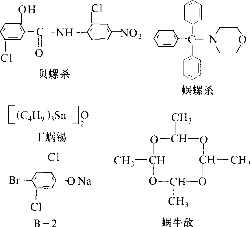特性 能消灭蜗牛、蛞蝓、钉螺等软体动物。钉螺是血吸虫的中间寄主,消灭钉螺对于预防血吸虫病非常重要。蜗牛敌一般制成2.5~ 4%饵剂,诱杀蜗牛、蛞蝓。五氯酚钠、贝螺杀、蜗螺杀用于水田灭钉螺,有效浓度分别为10~20、0.3~1、1 ~ 2毫克/升。丁蜗锡兼有杀蜗牛、杀真菌、杀藻活性,用于木材保护,不适用于农田。杀虫丁、杀虫环兼有灭钉螺和杀虫作用。灭钉螺剂量2.5克/米2,约为五氯酚钠灭钉螺用量的1/4。五氯酚钠对鱼类毒性太高,应寻找更有效而又对鱼类安全的取代药。B-2廉价,可生物降解,是日本开发的新杀螺剂。 杀软体动物剂molluscicide专用来防治为害农作物的软体动物如蜗牛、蛞蝓等一类药剂。还可以用来防治传播人、畜血吸虫病病原的中间宿主钉螺,如蜗牛敌、贝螺杀及五氯酚钠等。 |