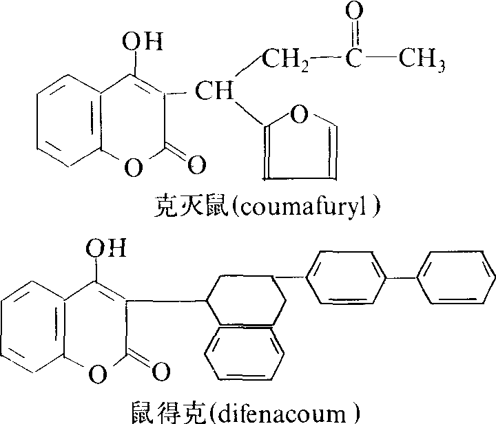 慢性(或多剂量)杀鼠剂 这类药剂的主要作用机理是作用于肝脏,对抗维生素K1,阻碍凝血酶原的生产,破坏正常血凝功能。中毒动物死于大出血(后被称为第一代抗凝血杀鼠剂)。毒作用缓慢须多次摄食才能产生效果。由于作用慢鼠类不产生拒食反应,故效果优于急性杀鼠剂。采用低浓度毒饵,鼠类可以反复多次取食,既符合摄食习惯又可减少其他非靶标动物及人畜误食中毒的机会,因此公认是最安全的一类杀鼠剂。重要的品种按化学结构可分为两类: ❶香豆素衍生物。共约10多种,使用较多的不过4~5种。如杀鼠灵、杀鼠迷、克灭鼠等。第二代抗凝血杀鼠剂的主要品种都属此类,如鼠得克、溴敌隆、溴鼠隆等。