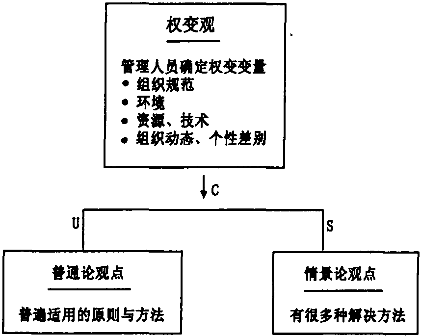 权变管理往往是一个取折衷的管理方法,它处于非常一般化的管理原则、方法(极端U)与非常特殊条件的情景管理(另一极端S)这一谱带之间的某一个中间点(C)之上(见图10)。
