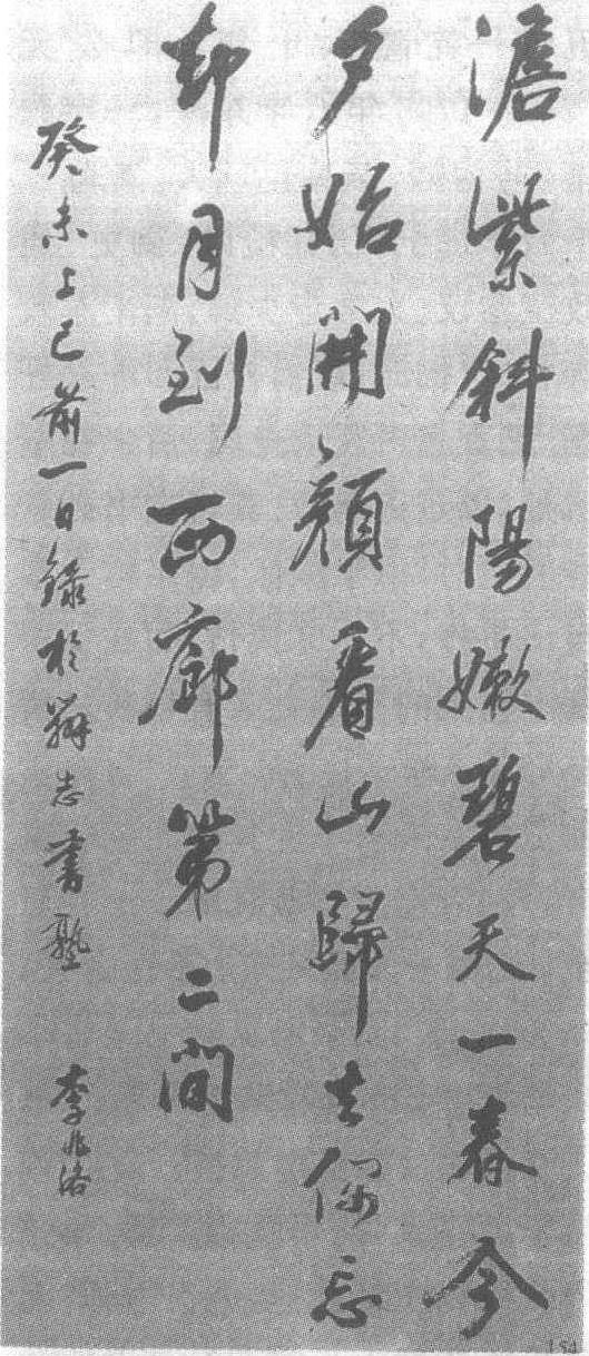 | 释义 | 李兆洛行书七言绝句轴清。纸本。纵131厘米,横55厘米。江苏省常州市博物馆藏。李兆洛(清乾隆三十四年—道光二十一年,即公元1769—1841年),字申耆,号绅绮、养一老人,江苏常州人。嘉庆进士,选翰林院庶吉士,后任安徽凤台县知县。其政迹卓著,去官后主办江阴暨阳书院,讲席和著书20余年。善诗,工古文,精考证及地理学,喜书。有《养一斋文集》,辑《骈体文钞》、《皇朝文典》、《大清一统舆地全图》、《凤台县志》、《地理志韵编》等。《清史稿》卷四百八十六有传。此七言绝句:“澹紫斜阳嫩碧天,一春今夕始开颜,看山归去偶忘却,月到西廊第二间。”款署:“癸未上巳前一日,录于辨志书塾,李兆洛。”款下钤朱文〈申耆〉、白文〈李兆洛〉两印。此件书于道光三年,即公元1823年,时李氏55岁,是李兆洛成熟之作。