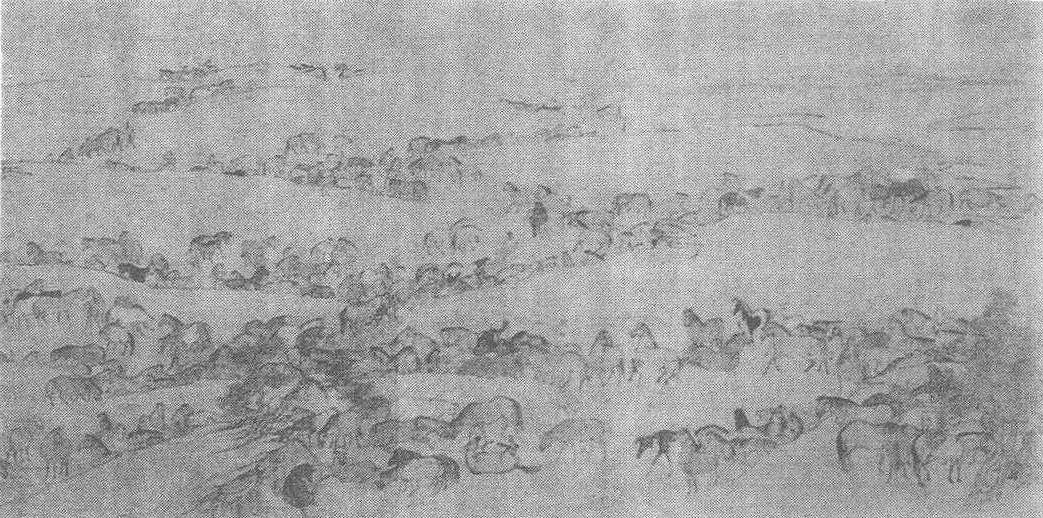 | 释义 | 李公麟临韦偃牧放图卷北宋。李公麟(见《李公麟五马图卷》条目)绘。绢本设色。纵46.2厘米,横429.8厘米。北京故宫博物院藏。《牧放图》的原作者韦偃是唐代中期的著名画家,一作韦鶠,长安(今陕西西安)人,生卒年代不详。善画人马山水,尤长于画马及松。他的父亲、叔父都是当时有名的画家,受家庭的熏陶,韦偃的笔墨功底很深,画马颇有创造。《唐朝名画录》记载,他曾“以越笔点簇鞍马人物、山水云烟,千变万态,或腾或倚,或龁或饮,或惊或止,或走或起,或翘或跂,其小者或头一点,或尾一抹”皆能“曲尽其妙”。与他同时的大诗人杜甫盛赞他“戏拈秃笔扫骅骝,倏见骐驎出车壁”。人称“韩干之亚”。这些特点可以在李公麟临写的这幅长卷中窥知大略。唐人极重马政,各苑俱以百千万计,此图所绘乃当时皇室苑囿中放牧的情景。图右,在起伏低缓的丘陵和宽阔平展的旷野之间,奚官圉人驱赶着一大群健壮的骏马蜂拥而来,如潮如流,滚滚向前,人喊马嘶,喧阗热闹,场面壮观,气势恢宏。画卷中部以后的丘坡水滩地带,奚官很少,马群逐渐散开,不受任何羁拌的约束,在辽阔的天地之间,尽情地享受着自由的快乐。它们有的奔逐,有的漫步,有的踢跳嬉闹,有的伫足歇息,有的打滚,有的安卧,有的吃草,有的饮水。马群由密而疏,步调由急而缓。整个场面呈现出一种从紧张到松弛的节奏变化。远处一条宽展清浅的河流逶迤而下,一些马匹转过土丘朝那里走去,方向逆转,犹如江流中卷起的旋涡。大部分奚官穿戴齐整,骑在马上,组成一个密集的阵容缓缓前行。他们的服色不同,身分地位也不一样。还有一些零散的牧者,衣着随意,或骑马或步行在马群中前驱后赶,有的疲倦了,便坐在树下休息。全图人物140多个,骏马1280余匹,以墨线勾勒,线条挺拔有力。人、马姿态各异,栩栩如生,各种颜色互相映衬,彼此呼应,明快自然,与丘峦土岗的单一色彩形成对照。画面内容繁而不乱,毫无壅滞之感。卷首有作者小篆题款二行:“李公麟奉敕摹韦偃牧放图。”此图的布局、立意皆不失韦偃原意,而马匹、人物已不见唐人那种雄健劲拔的气势,取而代之的是宋人清逸超脱而不狂放的风格,体现了李公麟自己的笔墨特点。《庚子销夏记》、《石渠宝笈续编》、《石渠随笔》著录。