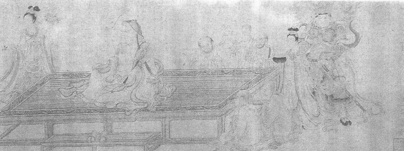 | 释义 | 李公麟维摩演教图卷(传)北宋。李公麟(见《李公麟五马图卷》条目)绘。纸本墨笔。纵34.6厘米,横207.5厘米。北京故宫博物院藏。此图所绘为佛教《维摩诘经》中的故事。维摩即维摩诘,是佛教中一位著名的人物,极有辩才。一次维摩称病在家,释迦牟尼派文殊师利作为使者前去探望。维摩在接见中,让身旁的一位天女向诸位来客身上撒花。如果这些来访的客人修行到家,鲜花就会落在地上,而如果有谁凡心未退,鲜花就会粘在身上,掉不下来。维摩便借此宣扬大乘教义。图中表现的正是这一场景。维摩苍苍白发,长须垂腹,面带病容而精神矍铄,他倚坐在榻上,一手执扇,另一只手比划着正在演讲。文殊菩萨,神色敬重,双手合十,端坐于对面的榻上悉心聆听。二人身后各有许多天女、神将、僧人在听讲,他们或围坐于榻旁,或侍立于一侧,面带虔诚。维摩、文殊之间是面带微笑的撒花天女和一个神态窘极的年轻和尚,小和尚的身上粘满了鲜花,正极力试图抖落花朵,这一极富戏剧色彩的情节,使单调的说法场面变得妙趣横生。图中人物形象特征已高度民族化和生活化了。维摩含蓄、深沉,是一个年长德迈、修养高深的中国士大夫形象,文殊师利则被描绘成一个雍容华丽、娴静典雅的豪门贵妇。此图卷场面很大,人物众多,但作者用笔极为细腻,在严整的法度之中又有飘逸流畅之气。人物的衣纹、飘带错综复杂,但却繁而不乱。坐榻、香几等陈设刻画得细致入微,显现出坚实的质感,与流荡的衣纹形成了鲜明的对比。幅中无作者款印,卷后有明王稚登、董其昌的题跋,都认为是李公麟所作。但近年有人以为是宋画院中高手的临本。