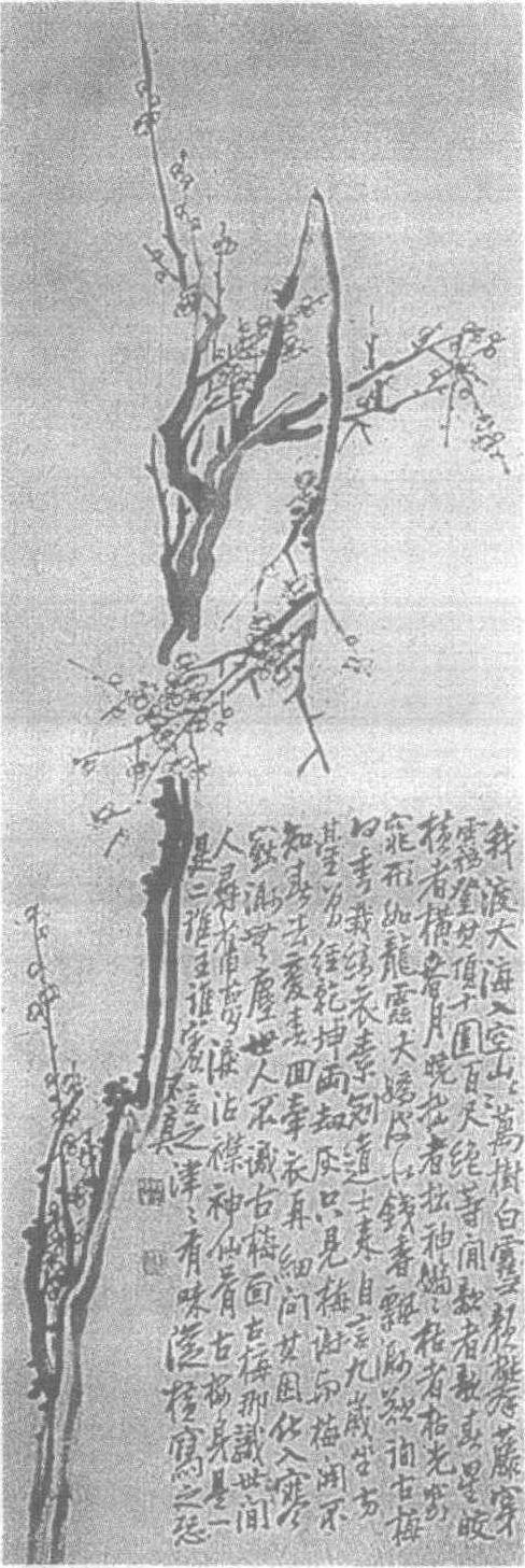 | 释义 | 李方膺《梅花图》纸本,墨笔。纵145.2厘米,横50.6厘米。现藏上海博物馆。画折枝老梅一枝,分枝欹、折、横、斜交错,枯、折而劲。笔墨老到。画面自题长诗一首: “我渡大海入空山,山山万树白雪颜,攀藤穿雾登其顶,十围百尺绝等闲。欹者欹,春星皎;横者横,春月晓; 拙者拙,神袅袅; 枯者枯,光窈窕。形如龙,云夭娇; 皮似铁,香飘渺。欲询古梅何年栽,缟衣素冠道士来,自言九岁坐芳台,曾经乾坤两劫灰。只见雪谢与梅开,不知春去复春回。牵衣再细问其因,化入寒烟渺无尘,世人不识古梅面,古梅那识世间人。寻旧梦,泪沾襟,神仙骨,古梅身,是一是二、谁主谁宾,言之津津有味,纵横写 之恐不真。”