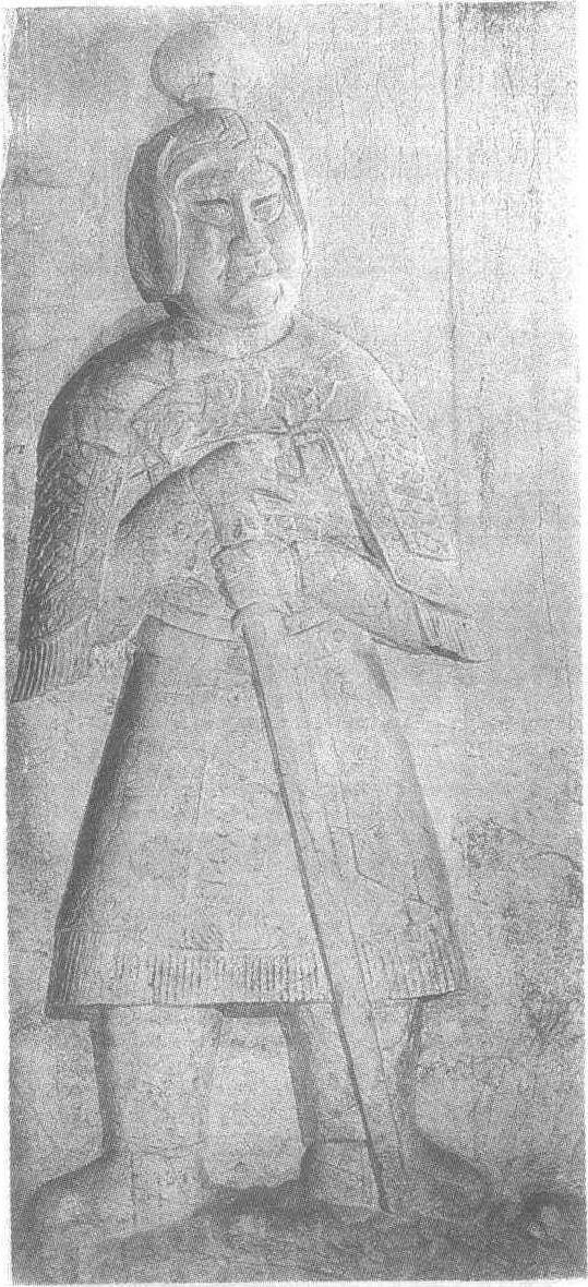 | 释义 | 李昪钦陵武士立像五代。南唐昇元七年(公元943年)。高约190厘米。江苏省江宁祖堂山李昪钦陵石刻像,位于其陵中室北壁西侧。东侧亦有一与此体态相同的武士,与之遥相呼应。武士头戴束一圆团的战盔,身穿铠甲,双手拄剑于胸前,两足外撇,呈八字形站立。其面颊肥圆,眼角上挑,嘴微裂,一副似笑非笑的样子,造型简括洗练,刻画繁简有序。李昪(公元888—943年),字正伦,五代南唐的建立者。