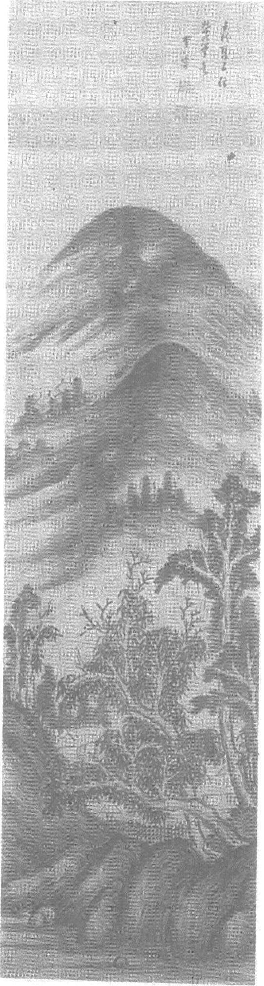 | 释义 | 李流芳仿北苑山水图轴明。李流芳(见《李流芳吴中十景图册》条目)绘。金笺本设色。纵129.3厘米,横36厘米。北京故宫博物院藏。潺潺的溪水边,矶石密集,几株生机盎然的茂树蔽护着蓠笆和错落的房屋。远处渐次升高,逶迤绵延的峰峦两侧,楼阁、林木交错显现,亦真亦幻,如海市蜃楼一般,与空濛的山岭完美地结合在一起,构成优美的远景。图的右上角有署款“壬戌夏五仿北苑笔意,李流芳。”钤“李流芳”、“长蘅”两方印。此幅构图丰满,笔墨浑厚秀润,勾描细腻。山、石、树,无不蕴含着律动,给人以隽永的回味。