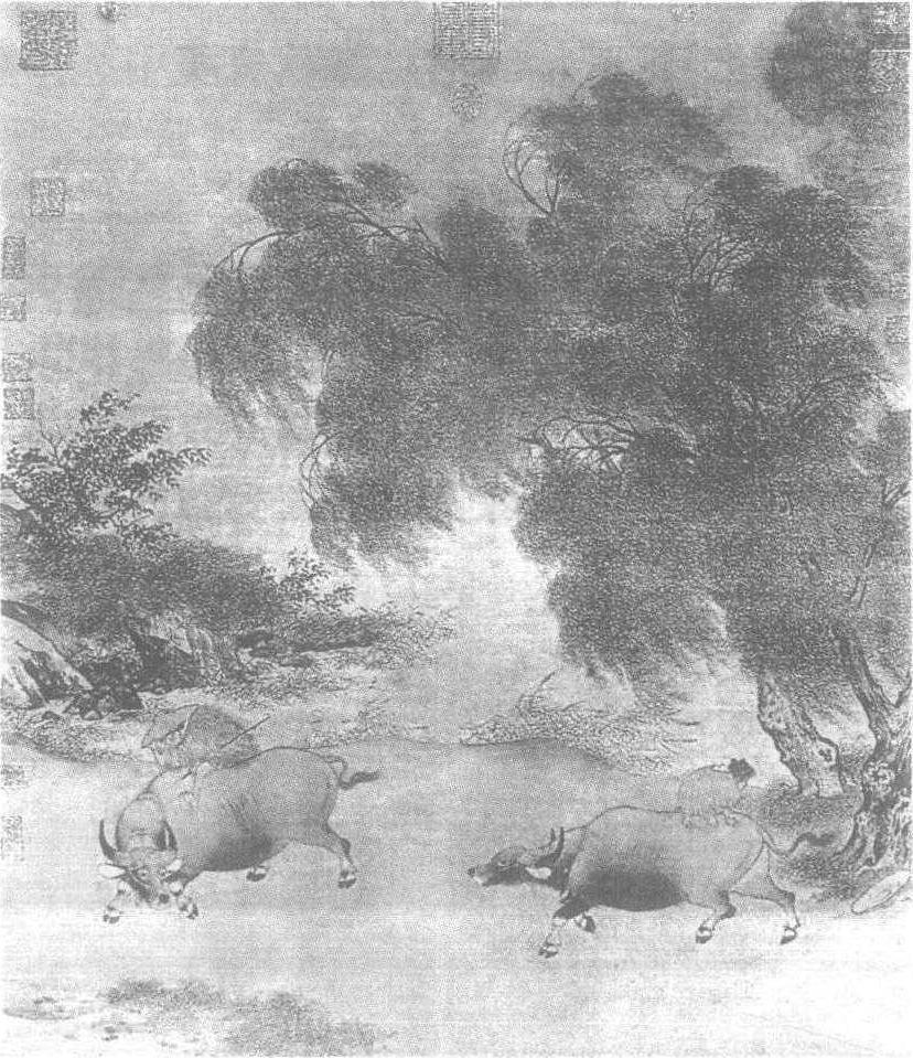 李迪 《风雨牧归图》 作者用笔精细,一丝不苟,却又不失豪放之势。古柳勾中带皴,苍劲有力。柳叶繁而不乱,密而不堵,墨色干润浓淡,自然晕化。空隙间见出的柳条穿插复叠,随风偃仰,颇见笔韵。牛的刻画更是传神。用笔用墨正合牛的形体结构及表皮色泽。那起落有致的四蹄,前伸的脖颈和甩来甩去的尾巴,把奔跑中的牛的神态描绘得生动、准确。可见作者平时作了深入细致的观察和写生。 李迪(生卒不详),河阳(今河南孟县)人。北宋宣和画院待诏,南宋绍兴画院副使,被赐金带。擅长花鸟、竹石、走兽,长于写生。用笔将工细与粗放相结合,形成了一种新的局面,是南宋花鸟画正在转变画风时的典型。主要作品还有 《雏鸡图》、《雪树寒禽图》等。 |