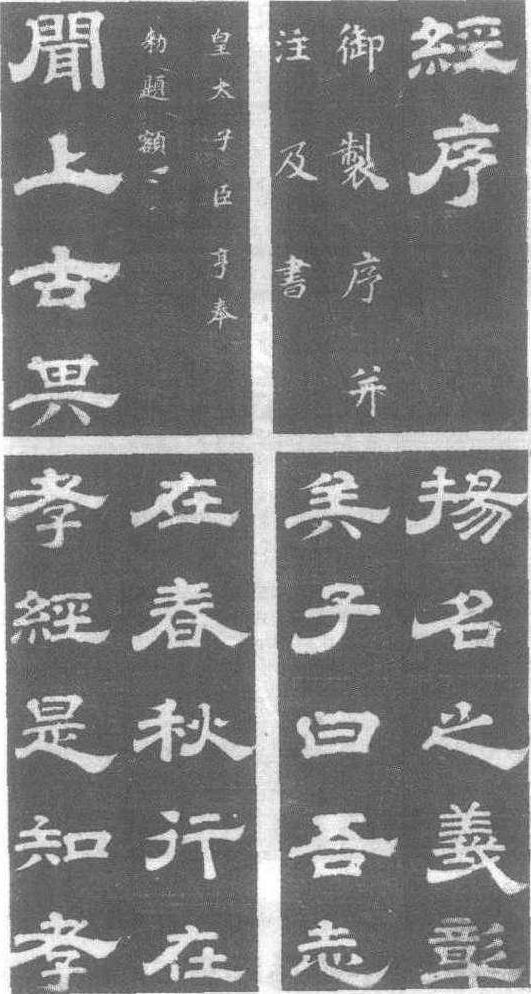 | 释义 | 李隆基隶书石台孝经唐。天宝四年(公元745年)刻。碑由四块高大的石围拢成台形,高590厘米,宽120厘米。并立于多层石阶之上,故名“石台”。碑原立在唐长安城务本坊的国子监太学内,天祐元年(公元904年)移至唐尚书省西隅(今陕西西安市社会路),后辗转迁移,今存陕西省西安碑林。李隆基(见《李隆基行书鹡鸰颂》条目)书。此碑记孔子的学生与孔子的问答辞。碑文四面刻,前三面隶书,各18行,行55字,后面:前7行隶书,中9行楷书,后3行行书,下截有题名四列,额篆书“大唐开元天宝圣文神武皇帝注孝经台”16字。此书端庄淳整,雄阔妍逸,颇有盛唐气韵,充分显示了帝王的威严及雍容华贵。明赵崡《石墨镌华》云:“开元帝书法,与《太山铭》同润色史惟则,老劲丰妍,如泉吐凤,如海吞鲸,非虚语也。”史称“玄宗第一手笔”。北京故宫博物院藏此碑拓本。