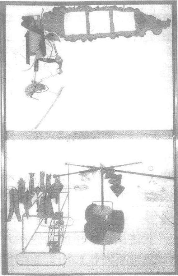 大玻璃 杜桑 这幅画中有两个中心的要素: 上部是生理性的形态,象征着新娘;下部画的是机械性的形态,象征着单身汉。上左部分石座儿上的蒸汽机,是招引单身汉的机械。这显露性爱的部位,不断作用于机械的欲望部分即下面的苦恼的齿轮。然后使这欲望部分成为机械性状态,即从蒸汽进到了内燃机的发动状态。这欲望的原动力,是单身汉机械的最后部分。欲望的发动不但在于和新娘的直接接触,也由于有水的冷却器将它和新娘隔开。这冷却器显示出,新娘不全是冷漠的冰块,而是热情地拒绝了单身汉们唐突的表白。这冷却器可能就是透明的玻璃。总之,这幅画可以说是一出 “爱情纠葛的滑稽剧”。