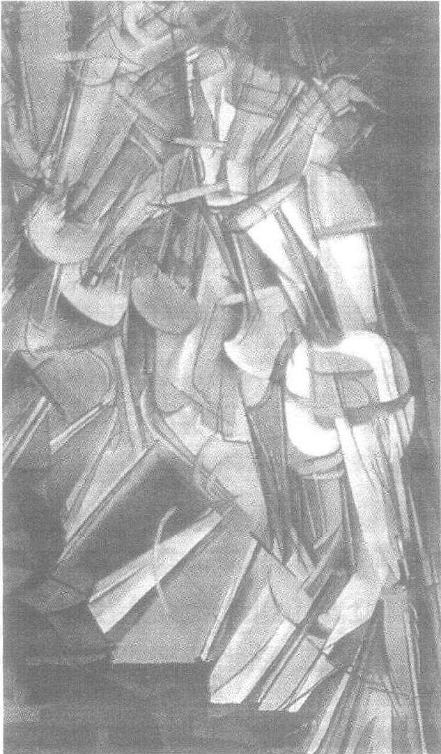 走下楼梯的裸女 杜桑 在这幅画中,还巧妙地运用了古典透视法。如果我们把“滑沟”的四条棱线延长,就能看到它们正好消失在中间隔壁(它又是抽象的地平线)的中点上。此点也是透视图法上与眼睛齐平的心点。正如物体投向地面的影子,是由三维变成二维的 一样,杜桑在这里无非是要揭示出,四维(即空间加时间)的投影恰好是三维。反过来说,这投影即画中的滑沟,又可以看作是不可视世界宛若在明净的月光下的反照。 马塞尔·杜桑(1887—1968)出生在法国北部诺曼底地方的乌兰威尔。他早年的作品受塞尚的影响甚深,不久后,他开始在绘画中导入运动。1913年所画的走下楼梯的裸女就是这种作风的最初尝试。画中表现了一组几乎连在一起的五个人体,正有节奏地从旋转楼梯上走下来,整幅画看起来好像是多次曝光的相片。显然杜桑是受到当时的电影革命和高速摄影机的启迪而作的。同时,在意大利兴起的未来派运动,当时也已经波及到巴黎。不过未来派仅停留在描绘运动的分解图上,而杜桑是将所谓 “裸体” 对象和运动不可分割地结合在了 一起。这就是,形象的处理是立体主义的,运动的感受则是未来派的。 在约半年后的 《新娘》《处女》和 《大玻璃》等作品中,不仅可以清楚地看到贯穿它们的这条线索,而且还有一种对于精神来说可谓是朝向最不可思议的东西的透视。这是艺术家自己的“内心的观照”,是我们下意识的经验的翻演。用杜桑自己的话来说,“我是从绘画的形而下性获得自由的。库尔贝在19世纪曾以形而下式的面孔来强调他的主题。(指《画室》)在我,有兴趣的不只是用视觉的产物,而且是用观念。”“绘画,不应是被视网膜所限制的东西。它应该是激发我们认识的欲望的东西”。 |