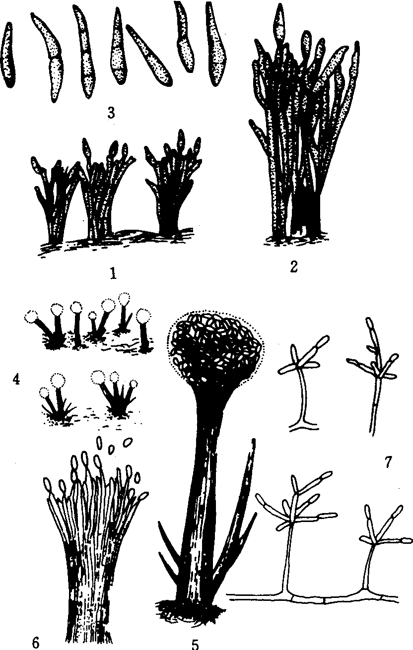 根据分生孢子梗和分生孢子的形态特征以及产孢方式,束梗孢目分为不同属,常见植物病原属(见图)。 拟棒束孢属(Isariopsis Fresenius) 束丝暗色,由松散的分生孢子梗组成; 分生孢子梗不分枝,直或弯曲,表面光滑; 产孢细胞圆柱形或棍棒形,多芽生,合轴式延伸; 分生孢子暗色或淡色,圆筒形至倒棍棒形,常弯曲,单生,顶侧生,多数有3个以上隔膜。引起叶斑。已知约10种,中国报道3种。常见的种是引起菜豆角斑病的灰拟棒束孢(I.griseola Sacc.)和引起葡萄大褐斑病的褐斑拟棒束孢(I.clavispora Sacc.)。 粘束孢属(Graphium Corda) 束丝暗色,直立,由平行菌丝组成柄状,顶部分叉成头状; 产孢细胞瓶状,全壁芽生式产孢,环痕式延伸,分生孢子梗顶部色淡; 分生孢子无色,单胞,椭圆至卵圆形,在束丝头部聚集成头状的粘孢子团。引起萎蔫等症状。中国报道2种。常见的种是引起荷兰榆病的榆粘束孢(G.ulmiSchwarz),其有性态是榆长喙壳[Ceratocystis ulmi(Buism.) Moreau]。 束梗孢目Stilbellales半知菌亚门,丝孢纲。菌丝有隔膜,淡色至暗色。菌丝体繁茂。分生孢子梗有隔膜,细长。若干个孢子梗在中、下部聚集形成孢梗束,暗色,上半部或大半部向外展开或分枝,端部产孢细胞全壁芽生产孢,环痕式或合轴式延伸。分生孢子球形、椭圆形或棍棒形,直或弯曲,有或无胶质,单胞或多胞,淡色、鲜色或暗色,多单个顶生,少数串生,偶有侧生。陆生,腐生或寄生,仅少数营寄生的种类引致植物叶斑、萎蔫等症状。本目仅有束梗孢科一科,含褐柱丝霉属和粘束孢属等100余属。 |