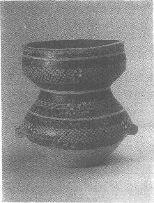 | 释义 | 束腰彩陶罐新石器时代马家窑文化马家窑类型。高18.3厘米,口径15.2厘米。1958年甘肃省永登县杜家坪出土。甘肃省博物馆藏。马家窑文化是黄河上游地区新石器时代晚期文化,年代约为公元前3300至公元前2050年,其特征是彩陶发达。马家窑文化经历一千多年,分为马家窑、半山和马厂三个类型。此彩陶罐形制为双腹、束腰,腰上部为一盆形,腰下部为一个双耳罐,似两件器皿叠立在一起。器外壁在彩绘前经仔细打磨,极为细腻而具光泽。器身有数道以黑彩涂抹,构成原地色彩的粗细弦纹和以黑彩所绘的网格纹,其间散布着白彩绘制的珠状花朵纹。此种类型的彩陶罐在马家窑文化中较为罕见。