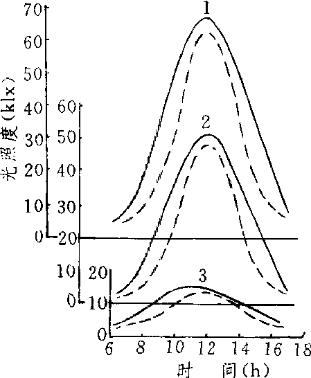 实测各行向小麦60cm长高处光照度日变化比较 1. 总光照度 2. 直射光照度 3.漫射光照度 ——东西行---南北行 |