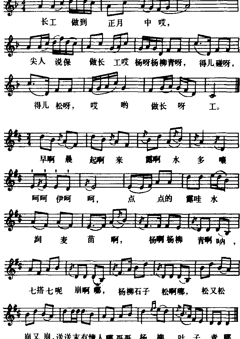 江苏民歌。也流行江南各地。音乐流畅、活泼,为加衬扩充的二句体乐段。通常流传两种不同的旋律:其一较为简练,加衬后重复句尾最后3字歌词,为五声徵调,长9小节;其二较为华丽,以细密的衬词扩充至23小节,为五声宫调。两首民歌都采用“杨柳青”的衬词,因而得名。