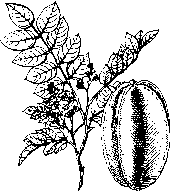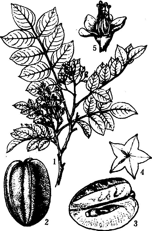 杨 桃 1. 花枝; 2. 果; 3. 果实纵剖面; 4. 果实横剖面; 5. 花 品种类型 普通杨桃有甜和酸两个类型。酸杨桃一般树型高大, 枝条略向上举。小叶比甜杨桃多1~2对。花序稍大, 花色较浓紫。果形瘦削,果顶部稍尖,肉质较粗而味酸。但抗逆性较强,丰产, 常做砧木或加工用。甜杨桃为主要栽培种。中国广东产区的品种有崛督、尖督、刘十杨桃, 周家种、林泉嘴金钱杨桃等。崛督丰产优质,尖督抗逆性较强, 刘十杨桃果大、早熟。台湾省品种有蜜丝种、二林种、白丝种、五汴头反种及南洋种等。品质以蜜丝种最佳, 栽培以二林种最广。广西和福建的品种, 大都由广东引进。 栽培技术要点 杨桃繁殖采用靠接、切接、劈接和补片芽接均可。砧木宜采酸杨桃的种子,洗去胶质,阴干、于10月前秋播或保存至次年2月至3月春播。秋播要护苗越冬,春季分床,当苗高50厘米以上茎粗1厘米左右, 便可嫁接, 每年3月至8月均可进行。种植方式每一大畦种单行、双行或三行,株行距5~6米, 每公顷种300~360株, 植期于3月至4月间进行。成年树施肥宜于春梢前、小果期、采果后及越冬前进行。幼树着重整形,青壮年树宜疏除树冠上层营养枝以抑制生长, 老弱树则培养树冠上部枝条以荫蔽树干, 并充分利用徒长枝填补树冠空位和更新老枝。果园管理宜注意排灌水、防风、防寒。主要虫害有: 鸟羽蛾幼虫为害花果, 酷热天气为害最烈; 黑点褐卷叶蛾幼虫蛀食果肉。此外, 还有果实蝇及毒蛾幼虫等为害果实。病害有叶的赤斑病和果的炭疽病。冬季清园是防治病虫害的关键性措施。 经济价值 杨桃供鲜食, 也可加工制罐头、果酱、果汁、蜜饯; 酸杨桃可加工制果汁、或佐餐调味品。营养成分含有蛋白质、脂肪、碳水化合物, 可食部分100克的热量为28千卡; 含有胡萝卜素、硫胺素、核黄素、尼克酸和抗坏血酸等; 矿物盐含有钙、磷、铁和钾、钠、镁等成分。叶、果、花、根和树皮均可入药, 对肠胃、呼吸系统和外科用药, 有一定辅助疗效。 杨桃carambolaAverrhoa carambola L.,又称五敛子、羊桃、阳桃。酢浆草科,杨桃属。常绿小乔木或灌木。2n=24。原产亚洲东南部,东南亚诸国均有栽培,中国广东、广西、福建和台湾等省区均有种植。树高6~7m。奇数羽状复叶,小叶5~13片,卵圆或椭圆形,先端尖,全缘。花小,钟形,多数集生成聚伞圆锥花序,腋生或着生于枝干上,花瓣白色或紫红色;子房上位,五室。果为肉质浆果,五棱,成熟果实黄绿色或淡黄色,表面光亮;肉质厚,软而多汁,有甜、酸两类。一年中能多次开花。性喜高温多湿,喜阴。用播种或嫁接繁殖。除鲜食外,可制罐头、干果、蜜饯等。