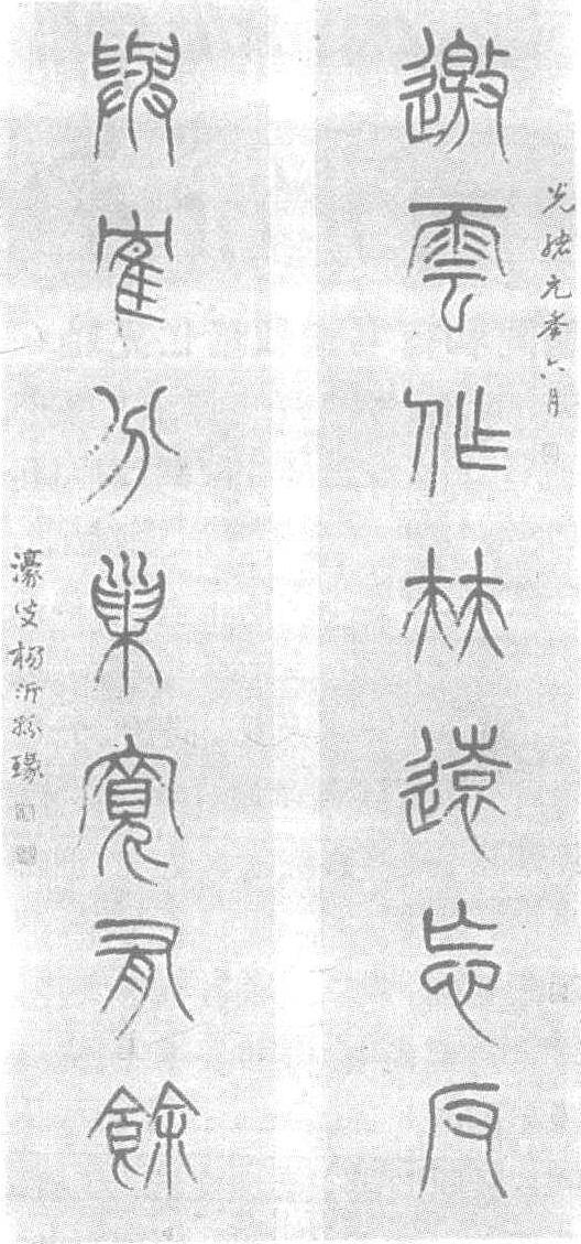 | 释义 | 杨沂孙篆书七言联清。纸本。纵134厘米,横30.4厘米。北京故宫博物院藏。杨沂孙(清嘉庆十八年—光绪七年,即1813—1881年),字子舆,号泳春、濠叟。江苏常熟人。道光二十三年(公元1843年)举人,官凤阳知府。工篆隶,笔意出自各种鼎款识及石鼓文,书名与邓石如相颉颃。《清稗类钞》评:“濠叟工篆书,于大小二篆,融会贯通,自成一家。”此件作品,篆书七言联:“邀云作伴远忘返,与鹤分巢宽有余。”古朴端严,功力深厚,是其篆书佳作。