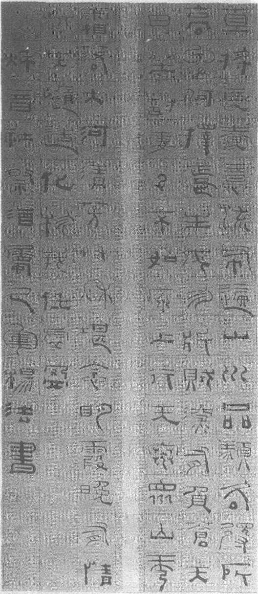 | 释义 | 杨法篆书五言诗轴清。纸本。纵122.9厘米,横33.9厘米。江苏省扬州博物馆藏。杨法(清康熙三十五年—乾隆十五年后,即公元1696—1750年后),字已军,号白云帝子。江苏江宁(南京)人,寓居扬州。擅长花卉,风格清逸,极有韵致,类似新罗山人,与“扬州八怪”有异曲同工之妙,所以亦曾被列入“扬州八怪”的行列。精刻印,所书篆、隶、行、草书奇古苍劲,独创一格。乾隆十年,即公元1745年,作《隶书古诗十九首册》。其书名大于画名,所作绘画,流传极少。清震钧《国朝书人辑略》云:“工篆籀,黄园中‘柳下风来相间月上’八字,是所书也。”近人马宗霍《霋岳楼笔谈》云:“狂草恣逸,殆不可识,殊无笔法。”此书五言诗将秦篆汉隶融为一体,结字匀称端庄典雅,行气流畅,有凝重浑劲之气,用笔轻重疾徐有致,线条粗细任意自然,有浓厚的画意,是杨法书法作品中不可多得的精品。