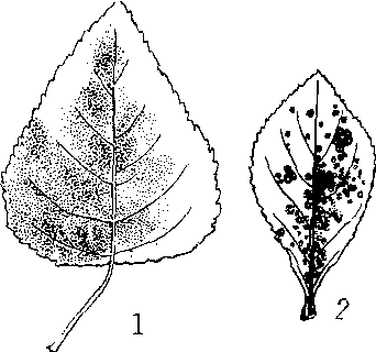 杨黑斑病 1.加杨病叶 2. 小叶杨病叶 |