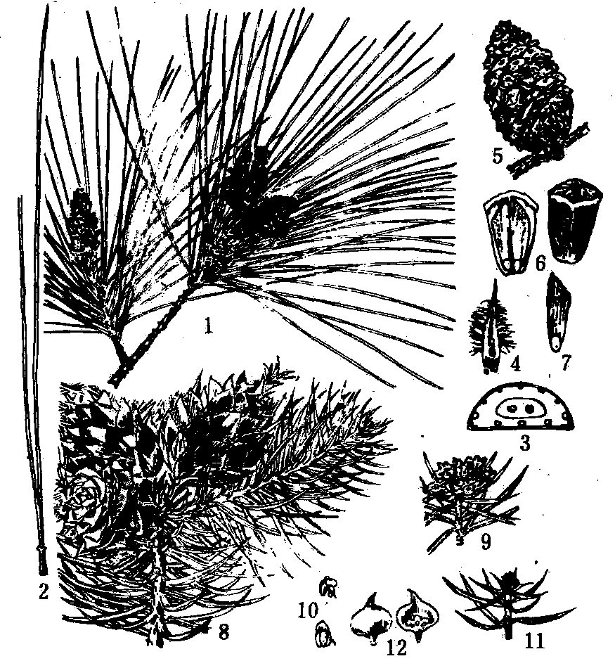 马尾松与杉木 (1~7.马尾松; 8~12.杉木) 许多种为大面积森林的建群种,是主要森林资源以及森林更新和荒山造林的主要树种,其中重要用材树种有红松、油松、马尾松、华山松、落叶松、冷杉、杉木、水杉、柳杉、柏木、鸡毛松等,园林绿化的珍贵树种有雪松(Cedrus deodora)、金钱松、圆柏、竹柏、罗汉松、白豆杉等。有许多种是中国国家重点保护植物,其中一级保护植物如银杉和水杉; 二级的如海南油杉、白皮云杉、太白红杉、华东黄杉、云南穗花杉; 三级的如油杉、黄杉、西藏长叶松、西藏红豆杉、云南榧树等。 松柏纲Coniferopsida裸子植物门中种类最多、分布最广、经济意义最大的一纲。常绿或落叶乔木和灌木。多数具树脂道,有管胞,无导管。叶条形、针形、鳞片形或披针形,单生或成束。雌雄异株或同株;小孢子叶球(雄球花)单生或组成花序;小孢子叶鳞片状或盾形,具2~9稀20个小孢子囊,囊内形成小孢子(花粉粒);花粉有或无气囊,松属成熟花粉含4细胞,杉科和柏科花粉无原叶细胞,在散落前均为1细胞花粉,南洋杉科的成熟花粉具15个原叶细胞,均产生不游动精子;大孢子叶球(雌球花)的珠鳞生于苞鳞腋部,胚珠生于珠鳞腹面基部。球果的种鳞呈鳞片形,扁平或盾状,木质、革质或肉质,成熟时张开。种子有翅或无翅。本纲现存松柏目(Coniferales),4科,44属,约400余种,主产北半球温带、寒温带高海拔和寒冷地区。中国有3科,23属,150种,分布几乎遍及全中国。许多种是重要的用材树种,如红松、杉木,园林观赏的珍贵树种有雪松、金钱松等。有些种是第三纪孑遗植物,如银杉、水杉和黄杉等。 |