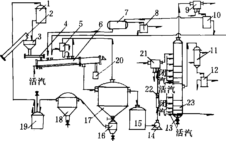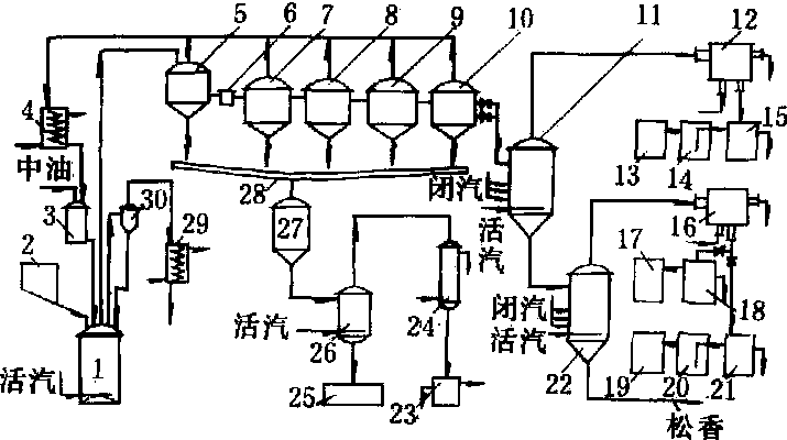 图1 连续水蒸气蒸馏法松脂加工工艺流程 经螺旋给料器不断送入连续熔解器,并加入适量的水和松节油。在熔解器中松脂被加热熔解。熔解脂液经过滤滤去大部杂质,流入连续澄清槽,杂质在残渣受器内定期排出。澄清后的脂液连续流入贮脂罐。中层脂液于中层脂液澄清槽澄清后流入压脂罐,用水蒸气压入中油贮槽回收。脂液泵将澄清脂液从贮脂罐抽出,经过转子流量计计量、预热器加热后连续送入蒸馏塔。蒸馏塔上段蒸出优油和水的混合蒸汽,经换热器(9)冷凝后流入优油油水分离器(10),分离后的优油流入贮槽,一部分送至熔解器作熔解松脂用,其余的经盐滤器除水后流入优油仓库。塔下段蒸出的重油和水的混合蒸汽由换热器冷凝后,经油水分离器分离水分。重油流入仓库。塔底部连续放出松香。 松脂熔解 为了除去松脂中的杂质和水分,先将松脂熔化成流体,然后进行净制。松脂熔解时加入松节油,使脂液中松香和松节油的比例成64~62:36~38,以降低脂液的浓度和粘度。加原料松脂8~10%的水,洗涤松脂,除去水溶性色素。加草酸0.05~0.1%,以还原深色的树脂酸铁盐。连续熔解器有卧式和立式的两种。卧式为一圆筒,由不锈钢板焊制,内有带孔翼片的螺旋器,推动松脂块前进。使松脂块有足够的熔解时间。在器底设直接水蒸气喷管,用水蒸气加热熔解松脂。立式熔解器为一圆筒体,由一根直立的进脂管与熔解器本体下部相连而成。器下部设直接水蒸气喷管,底部锥形,装有排渣阀门。松脂、熔解用松节油和水连续地沿进脂管流入熔解器下部,然后在熔解器中由下而上不断地被直接水蒸气加热而熔解。较脂液重的粗渣、泥沙等沉积于熔解器底部,通过锥底下的排渣阀门定期排放。熔解脂液从熔解器顶部流入滤渣器滤去大部杂质,进入净制工序。在熔解过程中,蒸发出的油水蒸气可用换热器冷凝流回熔解器中。熔解温度控制在96℃以下。 脂液净制 中国多采用澄清法。此法设备简单,维修容易,无须消耗动力,缺点是占地面积大,分离时间长,还需加一套中层脂液处理设备。通常采用半连续式澄清槽组,水分和杂质通过2~4个澄清槽分离,生产量较小时,也可只用一个澄清槽。脂液澄清连续进行,水与杂质间歇排出。澄清的脂液再经一小型过滤器,除去未沉降极少量的树皮杂质后,流至蒸馏塔。澄清过程中,在澄清脂液和下层水之间,有一层脂液、细小杂质和水的混合物,称中间层。中间层与渣水由各槽下部放出,再经进一步澄清后放回至熔解器回收,或直接蒸馏回收黑色松香和松节油。 连续蒸馏 净制脂液直接蒸馏时,沸点随脂液中松香含量的增加而升高,如欲将松节油蒸尽,温度将达到250~300℃,这将使树脂酸脱羧分解,大大影响松香质量。水蒸气蒸馏可降低蒸馏温度,保证松香质量。蒸馏时适当提高温度可减少水蒸气的耗量。马尾松松脂常压连续蒸馏工艺有3种:❶一塔三段。蒸馏塔用盲板分隔为三个塔段,相邻塔段间有溢流管相通,净制脂液经预热器加热至140℃左右,连续进入塔上部,在三个塔段的顶部分别蒸出优级松节油(优油)、中间松节油(中油,作熔解用)和高沸点松节油(重油)与水的混合蒸汽,经换热器冷凝和油水分离后得优油、中油和重油。从塔底连续放出松香。塔底温度一般为190~200℃。 ❷二塔三段。净制脂液经预热后进入第一塔,塔分两段,上段蒸出优油与水的混合蒸汽,经冷凝后得优油;下段蒸出中油、重油与水的混合蒸汽,经分凝塔分离中油和重油。塔底放出松香。 ❸一塔二段。蒸馏塔分隔成两段,上段蒸出优油与水的混合蒸汽,下段蒸出重油与水的混合蒸汽,分别冷凝和油水分离后得优油和重油,塔底放出松香。松脂中不含高沸点油分时可采用一个塔,亦不分段,蒸出全部优油,塔底温度亦可降低。 连续蒸馏塔一般为板式塔,采用浮阀塔较多。每一塔段底装有直接水蒸气喷管,喷出过热水蒸气,温度在300~350℃,每块塔板上装有水蒸气加热盘管,以加热脂液,供给松节油气化所需热量。各级松节油和水的混合蒸汽由换热器冷凝冷却。可用浮头式列管换器或较高效的螺旋板换热器。在换热面积较小时,可用盘管换热器。 间歇水蒸气法 分三个工序间歇进行,其原理和工艺条件与连续水蒸气法基本相同。间歇水蒸气法马尾松松脂加工工艺流程如图2。松脂从螺旋输送机进入料斗,经密闭加料阀间歇流入熔解釜,以直接水蒸气加热熔解后的脂液用水蒸气压入过渡槽。熔解时逸出的松节油和水的混合蒸汽经气液分离器和换热器回收。熔解脂液在过渡槽贮留10分钟后经过滤器流入澄清槽组(7、8、9、10)澄清。澄清脂液从澄清槽(10)分次流入一级蒸馏釜,蒸出优油和水的混合蒸汽,经换热器(12)冷凝、油水分离器分层和盐滤器(14)除去残水,优油由贮槽送往油库。蒸完优油的脂液分次流入二级蒸馏釜,按温度先后蒸出中油、重油,中油和水的混合蒸汽经换热器(16)冷凝、油水分离器分出的中油由贮槽泵往加油罐作熔解松脂用。重油和水的混合蒸汽经换热器(16)冷凝、油水分离器分层和盐滤器除残水,除水重油经重油贮槽送往油库。过渡槽和澄清槽逸出的松节油蒸汽经换热器冷凝流入加油罐回收。澄清时的中层脂液经排渣槽在中层脂液澄清槽再澄清后于喷提锅回收松节油,并蒸煮黑松香。