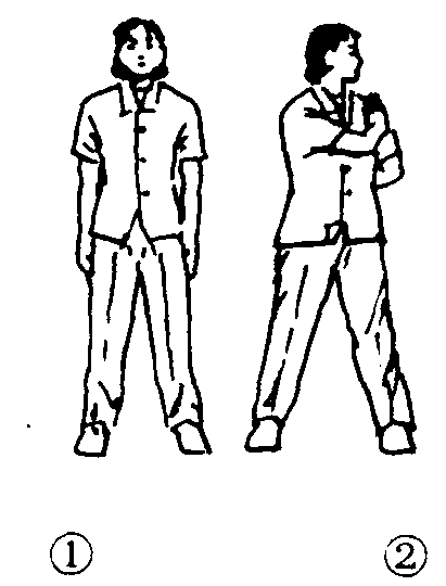 练功十八法第5套第6节。动作过程:两脚分立,略宽于肩,两臂自然下垂。(图2—4—149—❶)❶右掌虎口贴于左肩,左手背贴腰后,同时上体左后转,目视左肩。(图2—4—149—❷)还原成预备姿势。❸❹动作同❶❷一样,只是方向相反。共做4个8拍。注意事项:虎口贴肩时要垂肘,转体时两脚不得转动,转动幅度要大。此功法适应于漏肩疯、网球肘、腰背酸痛患者。