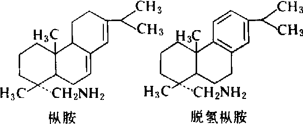 | 释义 | 松香胺rosin amine松香的一种含氮衍生物。属三环二萜类伯胺。以脂松香或浸提松香为原料衍生的称脂松香胺或浸提松香胺,主要成分为枞胺、长叶松胺。由岐化松香衍生的称歧化松香胺,主要成分为脱氢枞胺、二氢枞胺和四氢枞胺。枞胺(C19H29CH2NH2,MW.287)和脱氢枞胺(C19H27CH2NH2,MW.285)的结构式如下: