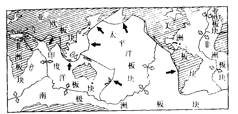 | 释义 | 板块构造Bankuaigouzao法国地质学家勒皮顺(X.Lepichon) 1968年提出的全球构造学说。认为地球的岩石圈不是整体一块,而是被一些活动的构造带(如海岭、岛弧、平移大断层)分割的若干板块。全球岩石圈划分为六大板块(如图)。即太平洋板块、亚欧板块、印度洋板块、非洲板块、美洲板块和南极洲板块。其中仅太平洋板块几乎全是海洋,其余各板块即包括大陆又有海洋。板块厚度50—150公里,板块间以海岭、岛弧、海沟和转换断层(类似一种大平移断层)为边界,板块运动的主要动力是来自地幔物质的对流,对流速率每年1—20厘米不等。洋中脊是对流的上升区,海底是对流循环的顶部(平流运动),海沟是对流下降区。因此洋壳产生于洋中脊,于海沟处消失,循环范围可达几千公里。板块内部强度很大,比较稳定,主要活动和变形发生于板块边缘。若两板块相向移动发生碰撞,则发生褶皱隆起、断层,形成高山,如喜马拉雅山等;两板块相碰的接触地带为板块缝合线,如雅鲁藏布江为亚欧板块与印度板块的缝合线;若海洋板块向陆地板块下部俯冲,则形成海沟、岛弧和海岸山脉,如日本岛弧和马里亚纳海沟等;板块分裂则形成裂谷、洋中脊和海洋;板块错动则形成转换断层。大板块又可分为中板块、小板块和微板块等不同等级。两板块之间的碰撞带或俯冲带一般是主要的火山带和地震带。如环太平洋火山带和地震带以及古地中海地震带和火山带都是分布在板块俯冲带或缝合线上。板块碰撞带和俯冲带又是挤压褶皱、隆起、断裂最强烈的地方,是形成高山的地带,如阿尔卑斯山、喜马拉雅山等。 简 化 地 质 年 代 表