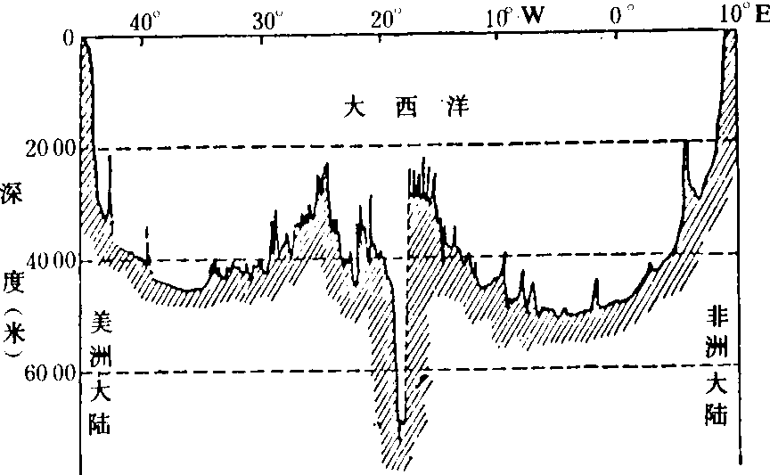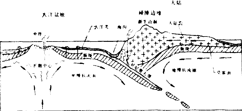 图 2 大西洋中脊沿赤道剖面 裂谷:一般指大陆型地壳因拉张作用形成的延伸很长的断陷带,其断裂性质几乎全为正断层,在轴部形成一系列阶梯状地堑,谷底常为长条形湖泊所占据。火山活动频繁,早期常以玄武岩喷发为主。地震活动亦频繁,是世界上主要的浅源地震带。它和大洋中脊一样,具有较高的热流值。在地貌上常表现为中央深陷的谷地或盆地,其中为新生代巨厚的沉积物所充填。一般认为裂谷是由于地幔上涌、地壳减薄和水平拉张作用产生的。目前世界上最大的裂谷带是非洲——阿拉伯大裂谷带,南起赞比西河口,北至土耳其南部,其总长约占现代地表大裂谷带总延伸长度的2/3。其中包括东非大裂谷带,共长2900公里,一般宽49~60公里;有的文献把红海到约旦河谷也包括在东非大裂谷之内。在裂谷内有很多规模较大的湖泊,如尼亚萨湖(长600公里、深700多米)、坦噶尼喀湖(长600公里以上,深达1435米)、阿伯特湖(长1200多公里)等。在裂谷中有许多火山。板块说认为裂谷已发展到扩展阶段,并即将形成象红海裂谷那样狭长的海域。东非大裂谷的北部为红海裂谷带,长2000公里,宽约240公里。它是现代地表上唯一能反映由大陆裂谷演化为大洋裂谷过程的构造,反映大洋张开初始阶段的构造现象。此外,如贝加尔裂谷带也很著名,长2500公里,南起蒙古西北部,北达南雅库特,呈北东走向并向南东凸出的弧形,裂谷带中有很多山间盆地和湖泊,其中贝加尔湖长700公里,深1740米,它蓄集了全世界淡水湖泊总水量的1/15。裂谷盆地中充填着新生代沉积物、褐煤及玄武岩等,厚达五、六千米。地震活动明显。 挤压型边界——又称会聚边界、聚合边界,这种边界是岩石圈板块彼此会合、对冲、碰撞的场所(图3)。如果大陆板块和洋壳板块相遇,其中一个板块常以约45°的角度俯冲到另一个板块之下,并逐渐加热熔融,被地幔所吸收,所以又称为破坏性板块边界(或边缘)。向下俯冲的板块,叫做俯冲板块,这种板块一般是洋壳板块,因为它是硅镁质的,比重较大。由于俯冲板块最终要为地幔熔融所同化,所以又叫板块消减带或消亡带。相对于俯冲板块来说,大陆板块因是硅铝质的,比重较小,往往冲覆到俯冲板块的上面,叫做上冲板块。这种边界在地貌上常表现为海沟和岛弧等。如果是两个大陆板块相碰撞,往往挤压、褶皱形成造山带,这样的地带称为地缝合线。 海沟和岛弧:由于洋壳板块向着大陆板块俯冲,常常形成平行于两个板块边界的深海凹地,称为海沟。它位于俯冲板块的一侧,通常长达数千公里,宽约100公里,深度七、八千米以至11000米以上。大部海沟具有不对称的V字形横剖面。板块俯冲带的前端在地幔中熔融,形成岩浆,上升成为侵入岩体或喷出成为火山。它们露出海面,则形成弧形分布的列岛,称为岛弧,也叫火山弧。特别是在环太平洋带的西侧,即大陆与大洋交界的地方,构成岛弧海沟系。岛弧的凸面一般都是朝向大洋,岛弧的外侧即向大洋一侧,有海沟与其平行分布;岛弧的内侧即向大陆一侧,亦即在岛弧与大陆之间,常形成链状分布的较小的大洋盆地,叫边缘海。从岛弧外侧到内侧,可以看到海沟、岛弧或火山带、褶皱带等依次呈带状分布。特别是从外侧到内侧,地震活动十分频繁。在太平洋东岸也有海沟分布,但在海沟的内侧往往是与海岸平行的长条山脉,如海岸山脉、安第斯山脉等。这是大洋板块向下俯冲,而大陆板块向上仰冲因挤压而成的褶皱山脉。