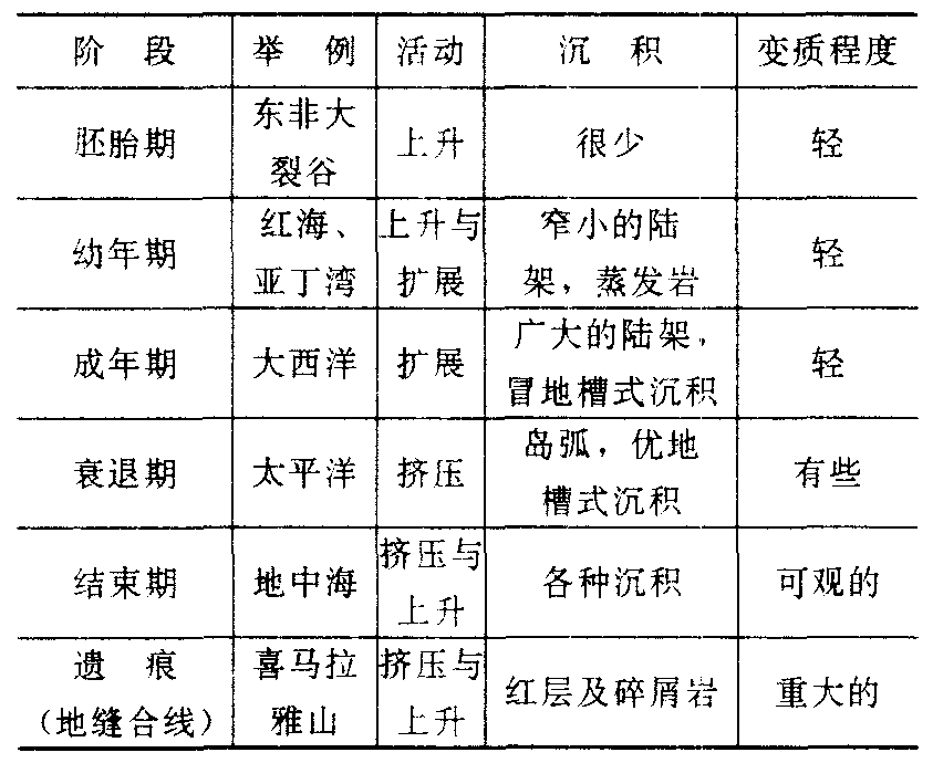 图4 转换断层 ❸板块理论与大洋发展阶段: 根据板块理论,地壳断裂形成裂谷; 根据裂谷分布的特点又分为大陆裂谷、陆间裂谷和大洋裂谷三类。分布于陆壳上的裂谷称大陆裂谷,如东非裂谷、贝加尔裂谷等,它们属于裂谷发育的初期阶段,也是大洋发展阶段的胚胎期;分布于过渡型地壳上的裂谷称陆间裂谷,如红海、亚丁湾裂谷,它们属于裂谷发育的中间阶段,也是大洋发展阶段的幼年期;分布于洋壳上的裂谷称大洋裂谷,即所谓大洋中脊,它们属于裂谷发育的最后阶段,是大洋发展阶段的成年期 (如大西洋)。据霍尔姆斯估计,红海和亚丁湾如果继续扩张,扩张速度若以每年5厘米计,最多经过一亿年即可出现一个新的大西洋。太平洋是地球上最老的大洋,已处于大洋发展阶段的衰退期。地中海则代表大洋发展阶段的结束期,它是宽阔的古地中海经过长期变化后的残留部分,在塞浦路斯岛上至今还残留着大洋中脊的遗迹。至于地缝合线.则只代表大洋发展的遗痕,如南亚次大陆在中生代后长期北移,最后和欧亚大陆相撞击,合为一体,在两者缝合线的附近,由于挤压形成了巍峨的喜马拉雅山脉 (见表)。 大洋发展阶段