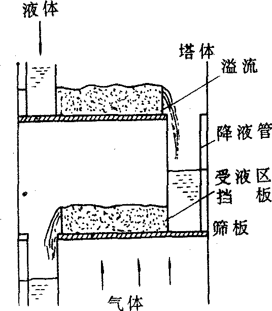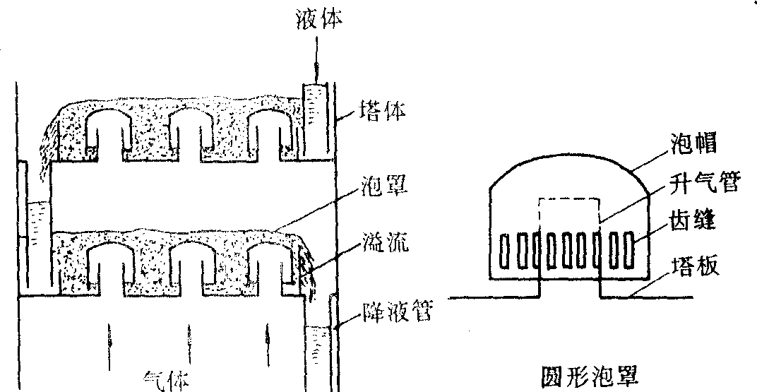 图1 筛板塔 板式塔主要由塔体和塔板组成。塔板具有多种形式,其基本构件为气体分布元件和液体溢流装置。溢流装置的作用是保证液体逐层沿塔板顺畅地下流,并在塔板上维持一定高度的液层和一定的停留时间,使气液两相在塔板上有足够时间充分接触。气体分布元件的作用是将下层塔板上升的气体均匀分散在液层之中,使气液两相充分密切接触。板式塔的各种形式主要是按气体分布元件的结构特征来区分。目前工业上常用的板式塔主要有筛板塔、泡罩塔和浮阀塔等。 筛板塔是利用多孔或栅状筛板作为气体分布元件。气体由下而上经过筛板上的孔,被分散成气泡通过液层。液体则利用溢流装置在塔板上维持一定的液层高度,并逐层向下流动。图1为筛板塔的原理结构示意图。筛板塔在气速不高的状况下操作时,气液两相以鼓泡方式进行接触。若在较高气速下操作,则塔板上将形成泡沫状态,工业上称之为泡沫塔。泡沫状态与鼓泡状态相比较,具有更大的气液接触面积,并且气液两相接触面不断更新,使传热或传质过程得到强化。若筛板塔取消溢流装置,液体直接由筛孔淋降而下,并利用气体作用在塔板上维持一定液层高度,工业上称这种结构的筛板塔为淋降式筛板塔 (或称穿流式筛板塔) 。 泡罩塔是以泡罩作为气体分布元件,泡罩有多种形式,最常用的是圆形泡罩和条形泡罩。泡罩由升气管和泡帽两部分构成(见图2)。升气管固定在塔板上,其高度略高于溢流堰高度。泡帽覆盖于升气管上方,其下缘开有齿缝或条缝用于分散气体。气体沿升气管上升,遇泡帽折回向下流动,经泡帽下缘的齿缝被分散成气泡,与塔板上液体相接触。液体利用溢流装置逐层下降流动。工业设备中,每块塔板上有的只装有一个大型泡罩,有的则装有几个到几百个小型泡罩。例如,纯碱工业中的碳酸化塔就属于前者,主要为了便于清洗固体沉淀物; 在石油化工业和化学工业中,为了使气体分布均匀,提高过程效率,则多采用多泡罩装置。
